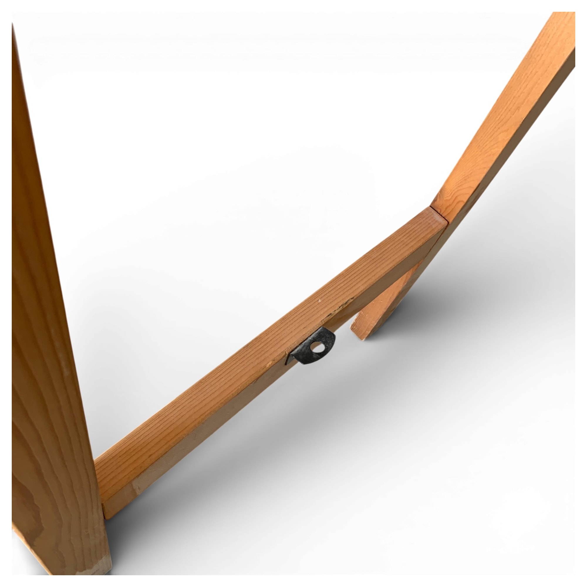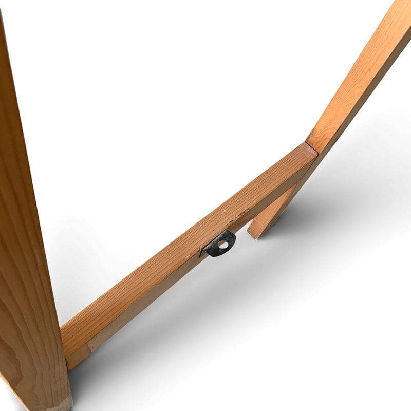 Il dettaglio nascosto è la chiusura metallica integrata nel traverso posteriore, soluzione robusta che evita aperture accidentali. La cornice sfrutta l'abete a vista, con venatura verticale continua, segno di una lavorazione attenta ma destinata a spazi domestici. Apparentemente essenziale, la tensione tra leggerezza visiva e stabilità strutturale rivela la precisa scelta di evitare elementi decorativi superflui.