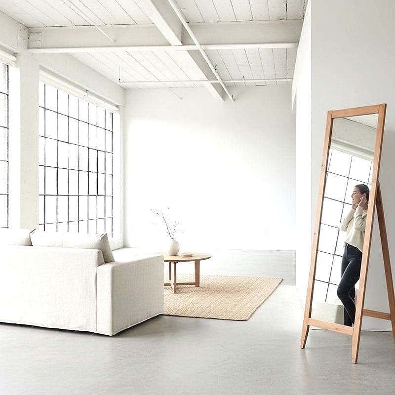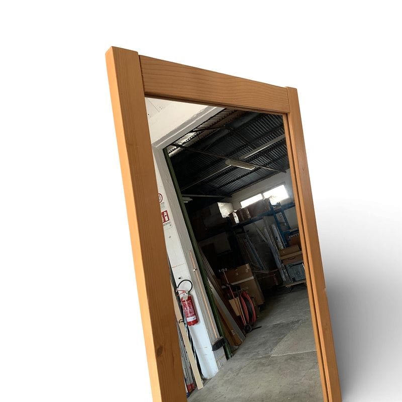- Cornice e supporto in legno massello di abete, specchio piano argentato, chiusura/fermo in metallo integrato nel traverso posteriore
