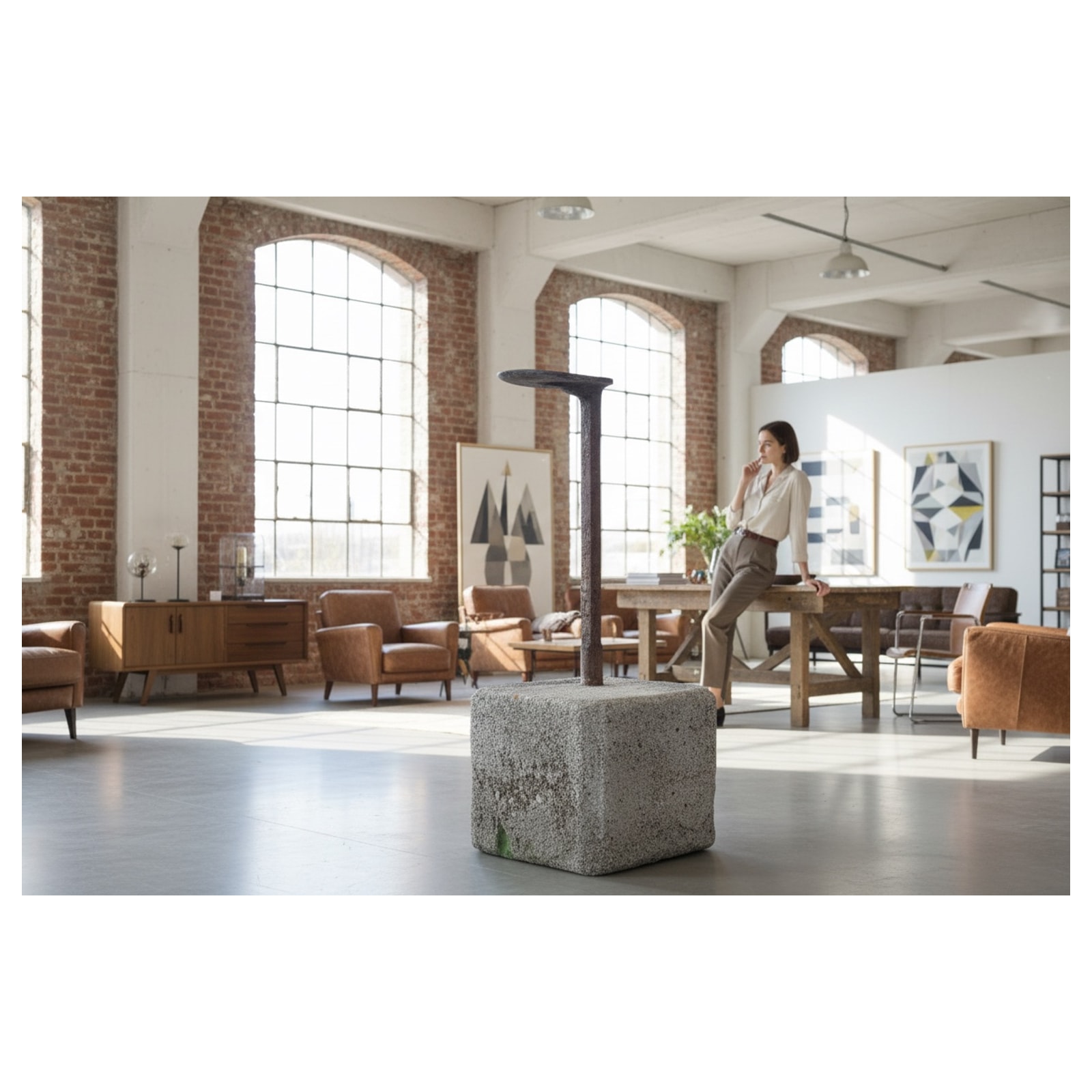 - base in cemento grezzo, palo in ferro industriale riciclato, piano superiore in metallo originale riadattato (pala di macchina agricola)