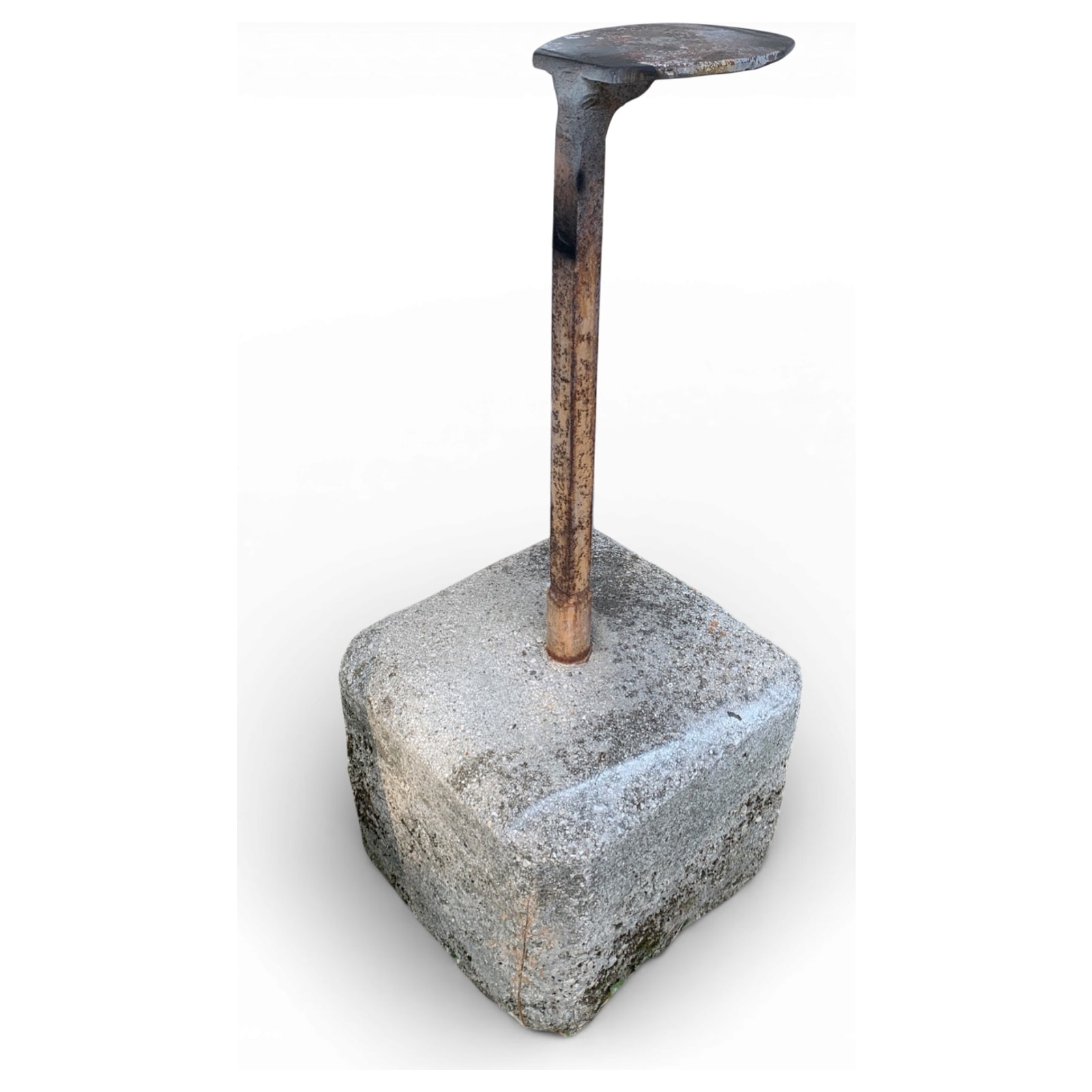 Raro esempio di recupero industriale anni '60, questo tavolino nasce dall’assemblaggio di una base in cemento grezzo e un palo in ferro riciclato. La parte superiore richiama la pala di una vecchia macchina agricola, riadattata a vassoio con margini irregolari. Il dettaglio più curioso: la stratificazione di ruggine naturale è stata lasciata intatta, a testimonianza del tempo e della vocazione brutalista dell’oggetto.