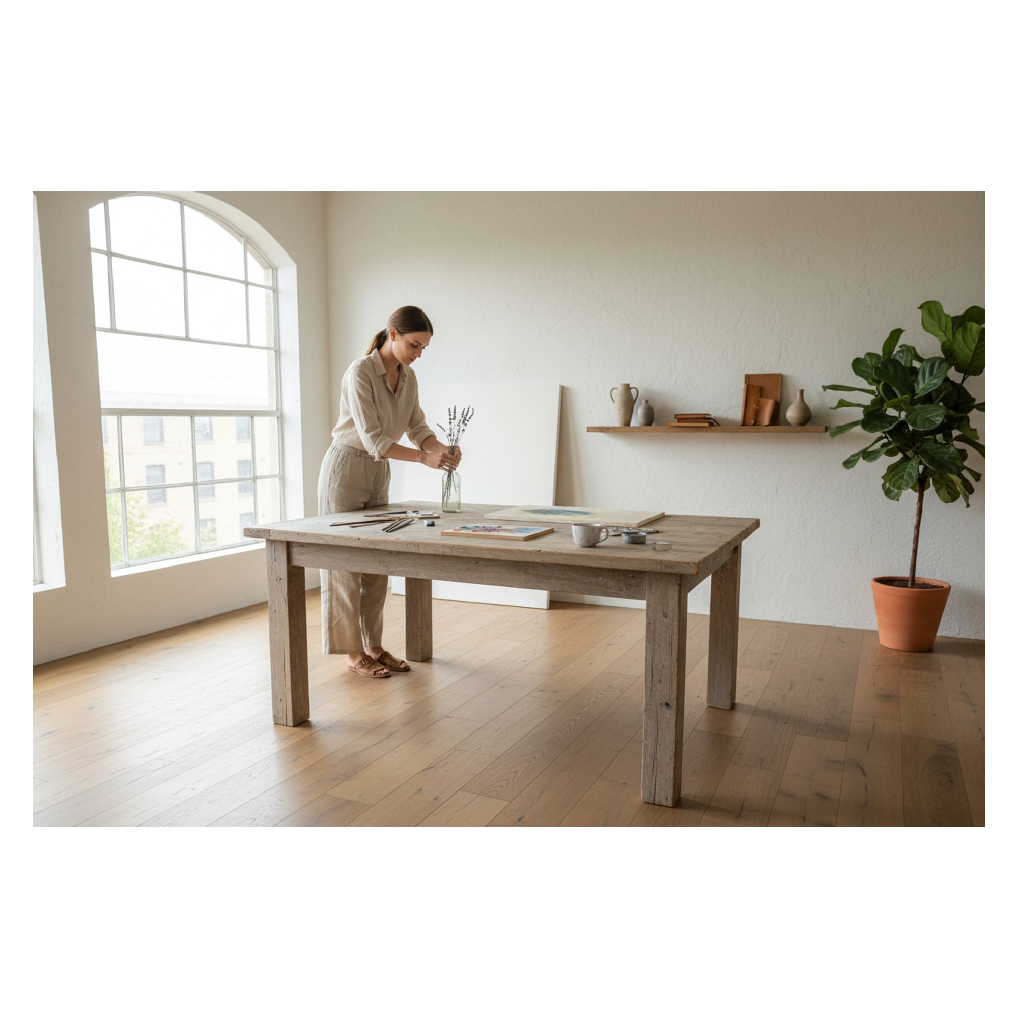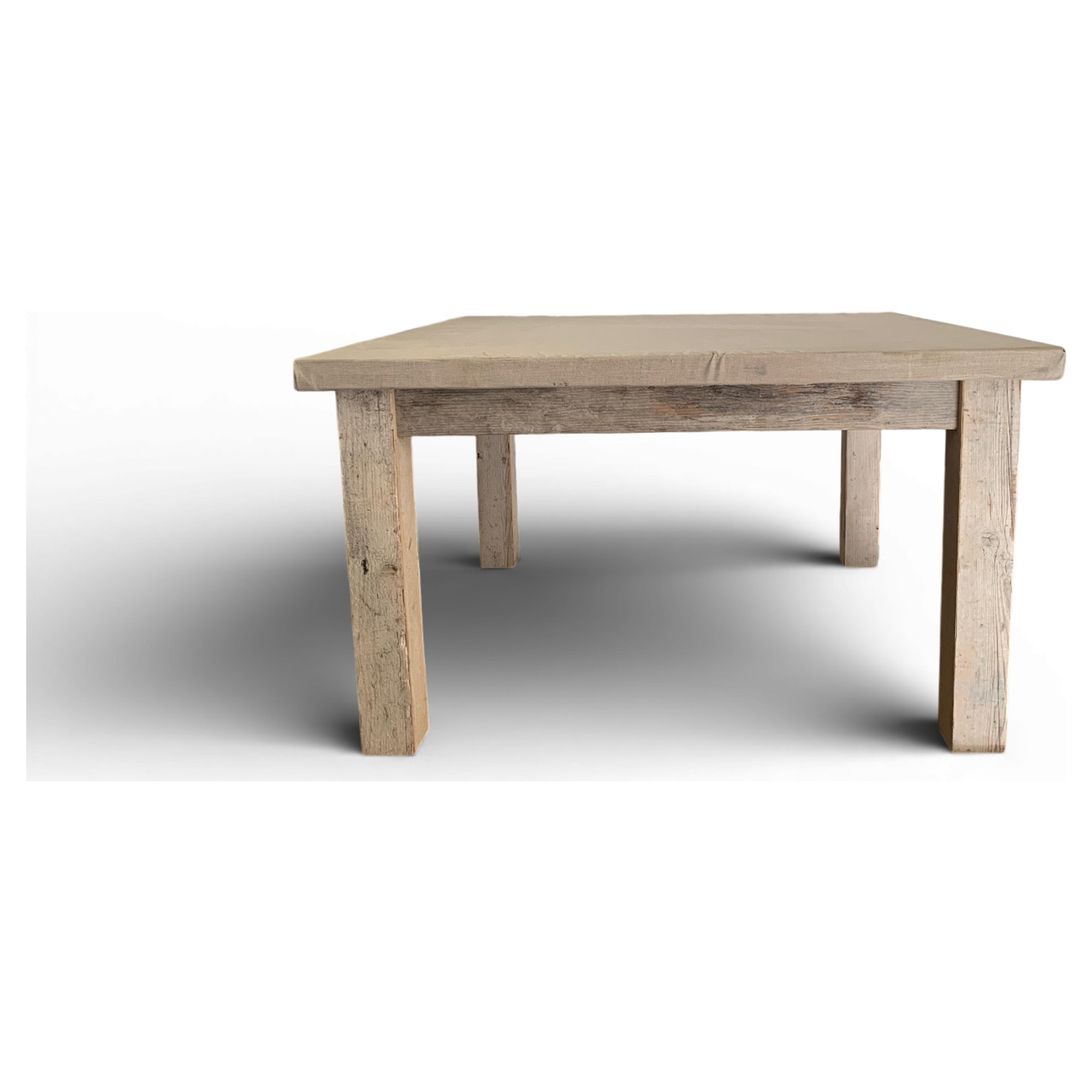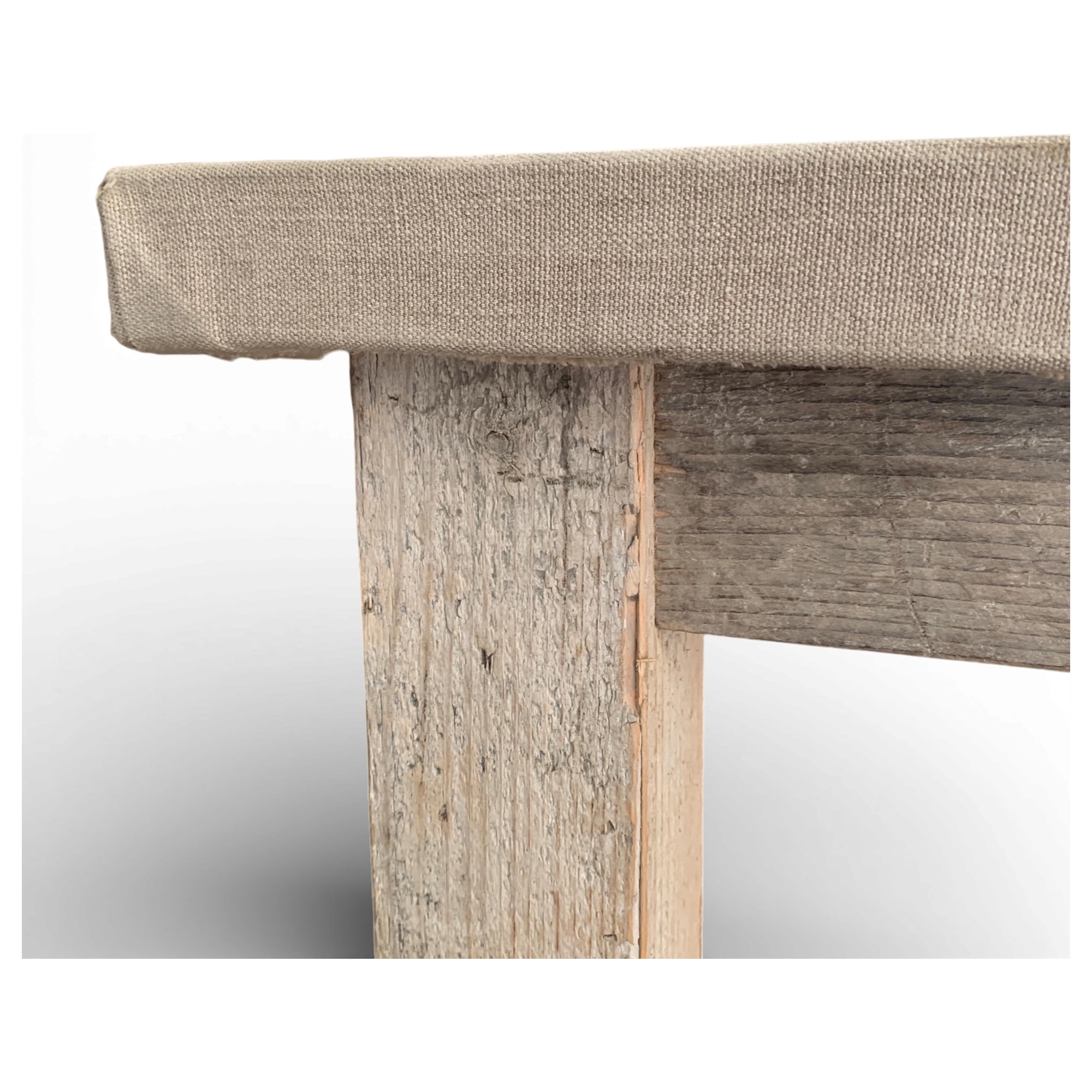 Questo tavolo da atelier rivela la sua anima creativa grazie al piano rivestito in tessuto di juta grezza, immutato nel tempo. Un dettaglio inatteso: il bordo del piano richiama le tele da pittore tese manualmente, segno di un uso autenticamente artistico. Il legno di recupero conserva la memoria di antichi laboratori, dove ogni imperfezione è racconto silenzioso di gesti artigianali.