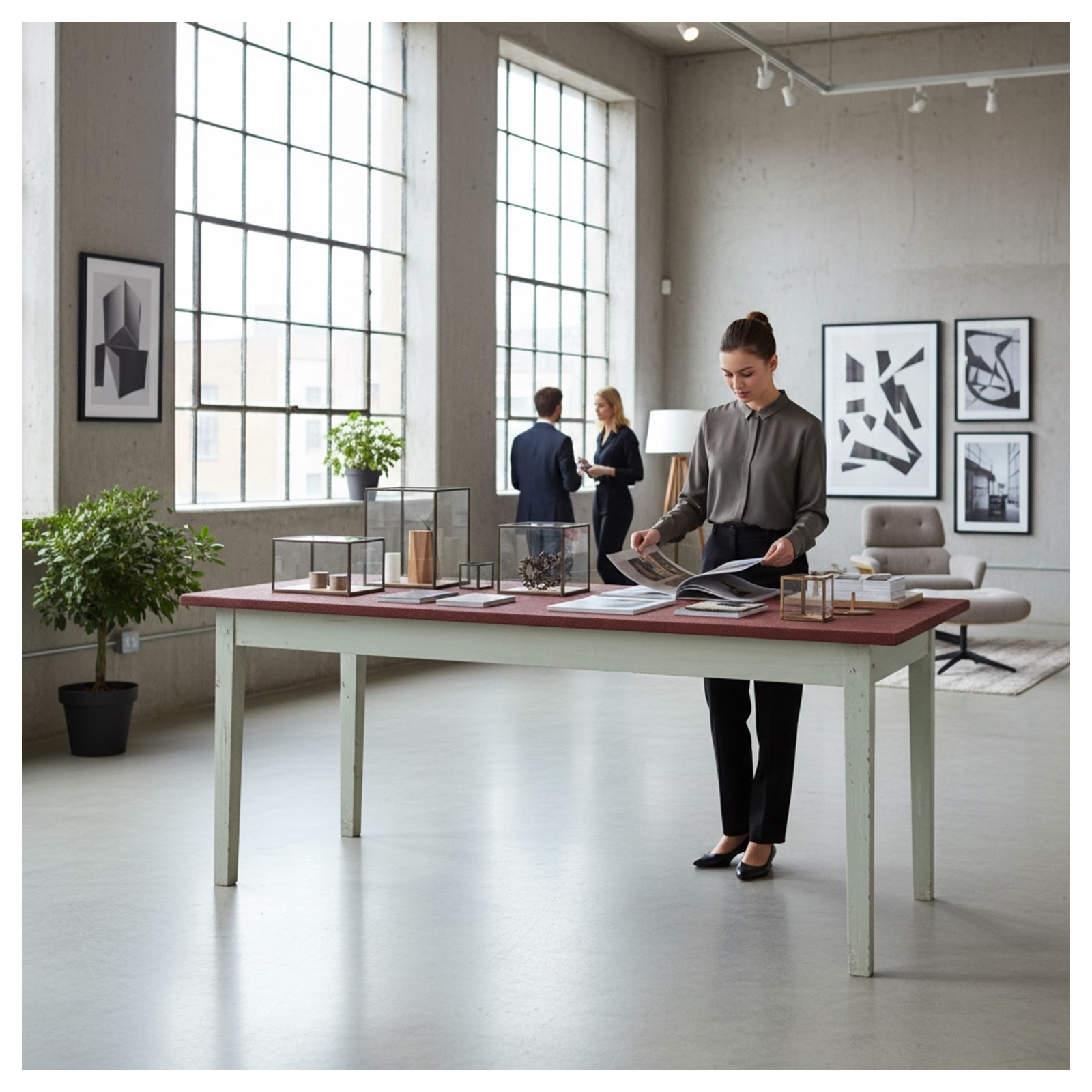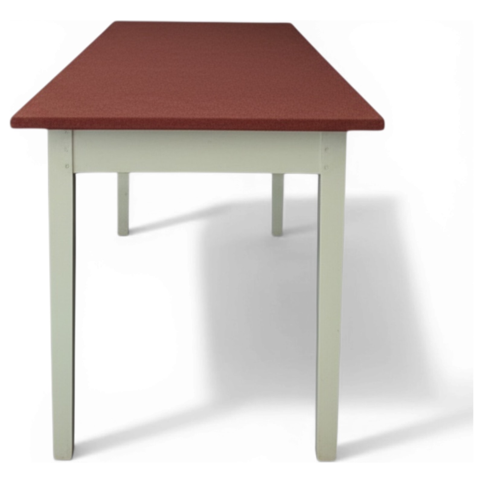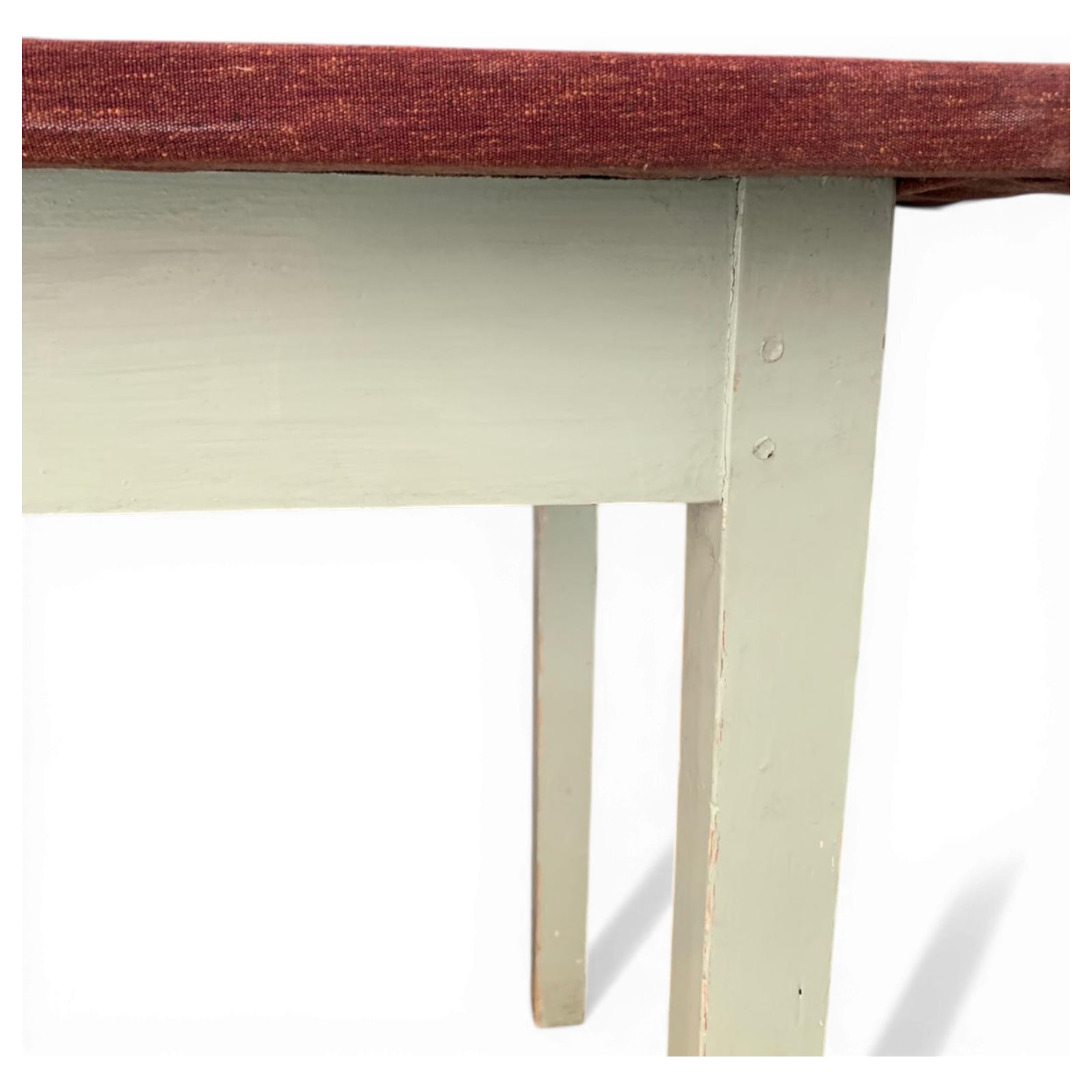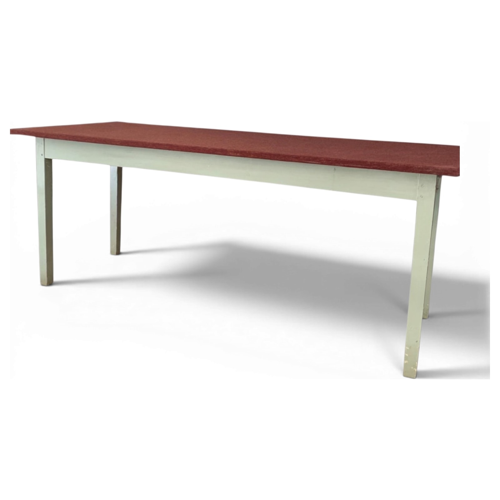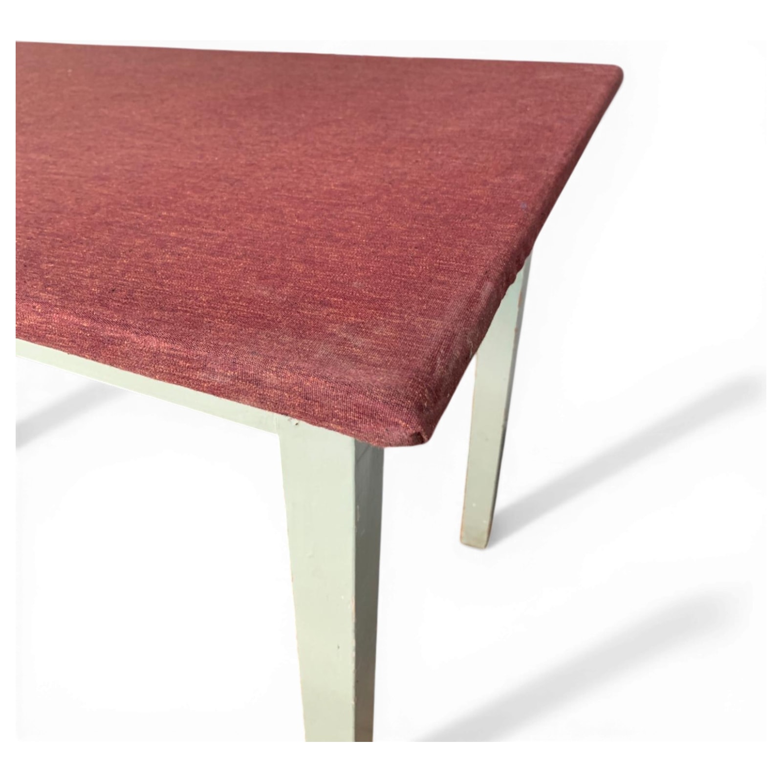 Tavolo da lavoro proveniente da atelier italiano, riconoscibile dall'insolito piano rivestito in tessuto rosso bordeaux, progettato per attutire urti e graffi sugli oggetti lavorati. La patina e i piccoli segni di colore sulle gambe testimoniano anni di utilizzo in ambiente creativo. Il piano tessile, raro per l’epoca, fu spesso scelto da fotografi e artisti grafici per evitare riflessi nella lavorazione a mano.