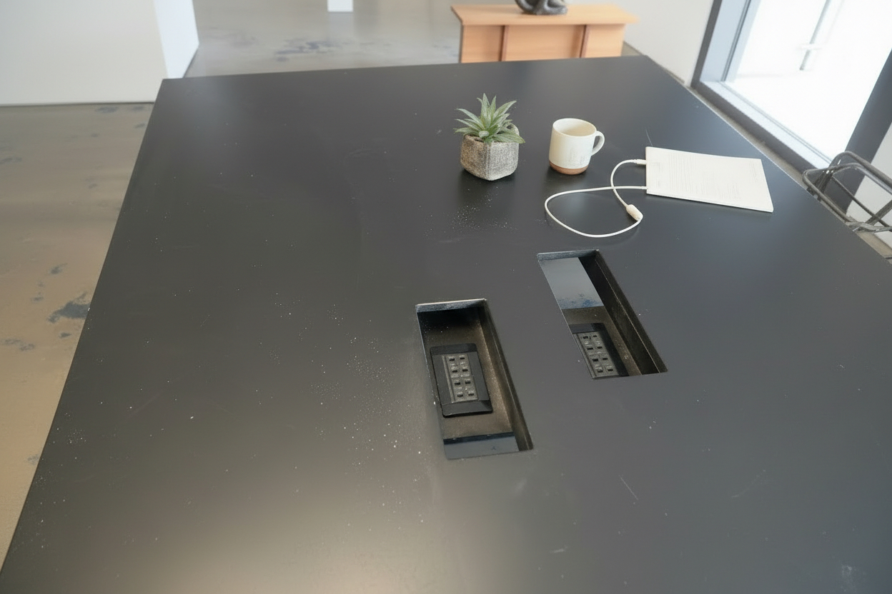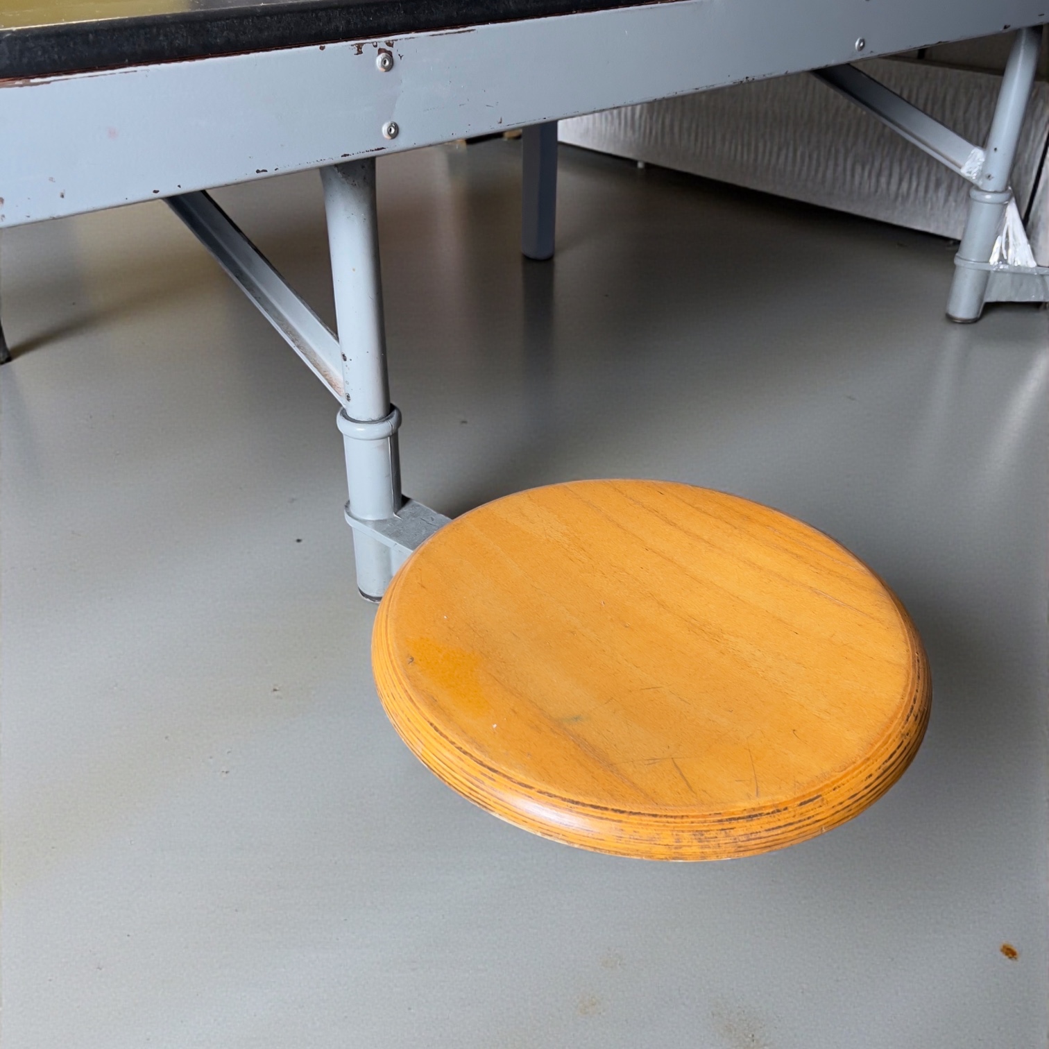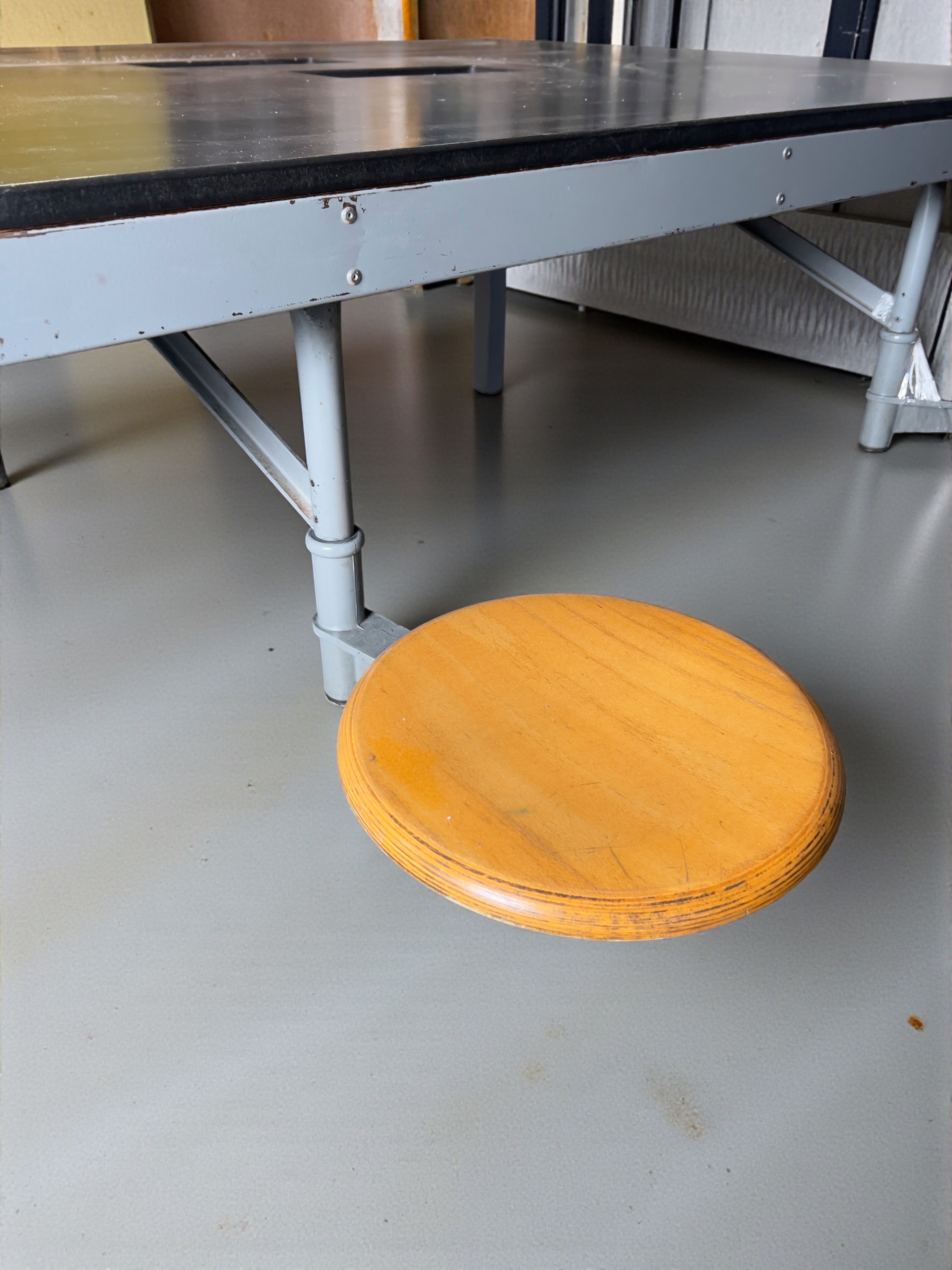Singolare tavolo industriale, originariamente concepito per ambienti collettivi come poste o archivi pubblici, caratterizzato dall'integrazione di due sgabelli per lato in legno montati su bracci metallici. Il solido telaio in metallo verniciato conferisce robustezza all’insieme, mentre il piano in MDF nero dona una presenza rigorosa e funzionale. Visibili sulla superficie due aperture rettangolari dove sono incassate 2 scatole elettriche con multiprese per l’utilizzo di apparecchiature elettroniche. Oggetto ideale per collezionisti o designer alla ricerca di arredi originali dalla forte personalità e storia.