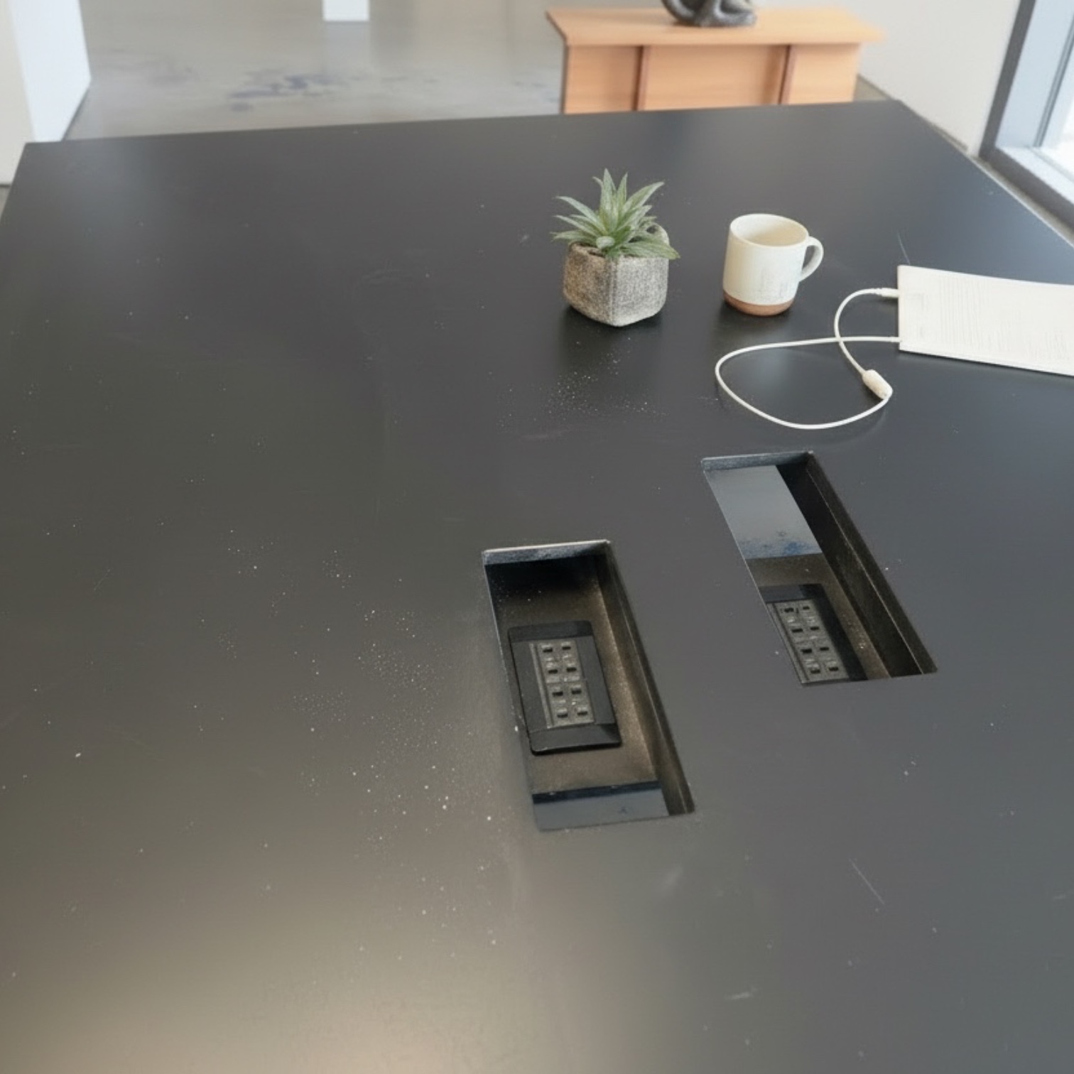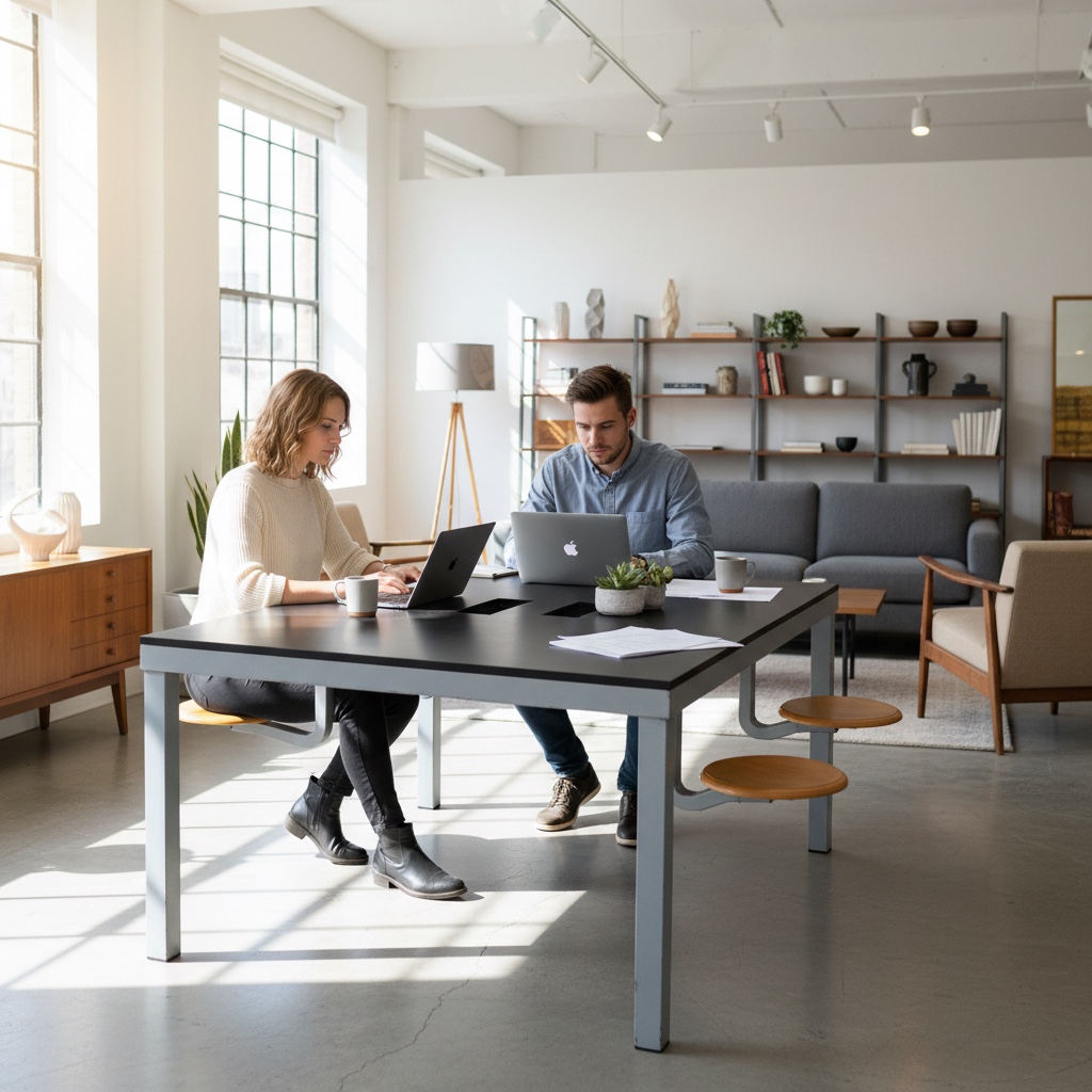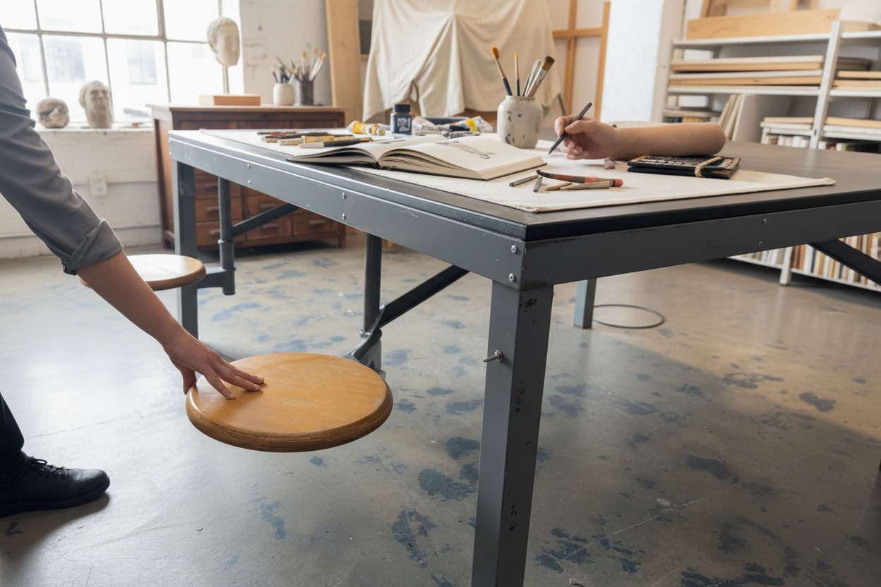 Singolare tavolo industriale, originariamente concepito per ambienti collettivi come poste o archivi pubblici, caratterizzato dall'integrazione di due sgabelli per lato in legno montati su bracci metallici. Il solido telaio in metallo verniciato conferisce robustezza all’insieme, mentre il piano in MDF nero dona una presenza rigorosa e funzionale. Visibili sulla superficie due aperture rettangolari dove sono incassate 2 scatole elettriche con multiprese per l’utilizzo di apparecchiature elettroniche. Oggetto ideale per collezionisti o designer alla ricerca di arredi originali dalla forte personalità e storia.