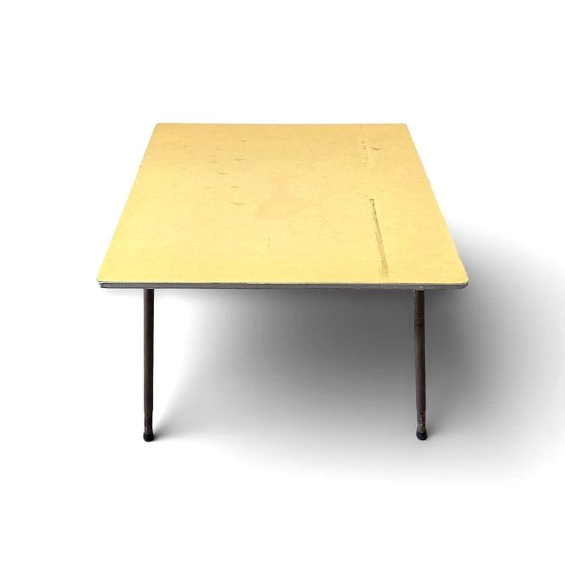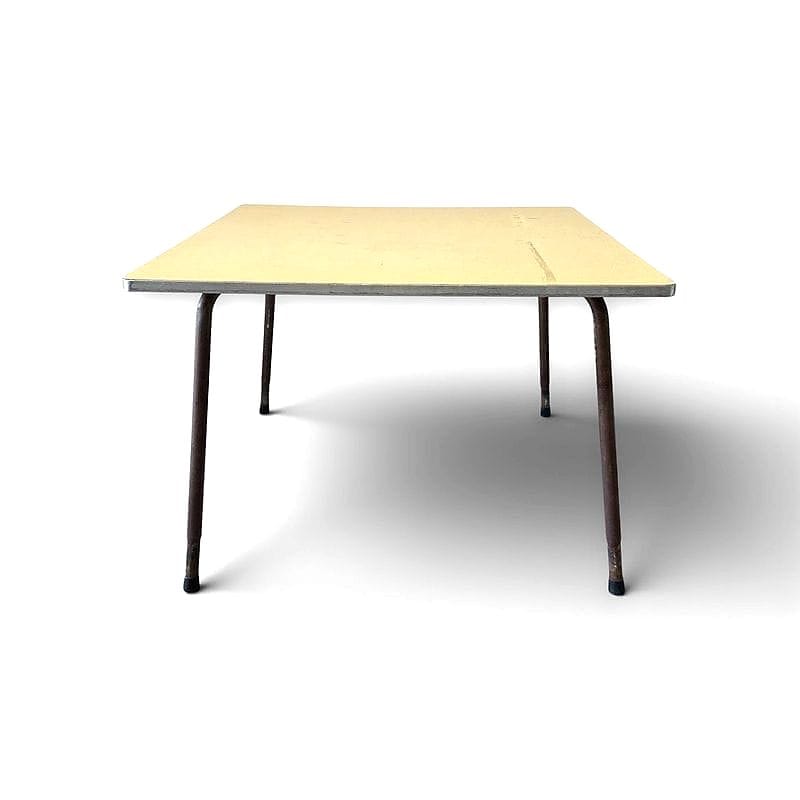 Questo tavolo nasce dall’immaginario scolastico e industriale degli anni ’60: il piano in formica gialla era scelto per la sua incredibile resistenza e facilità di pulizia, rivoluzionaria all'epoca.