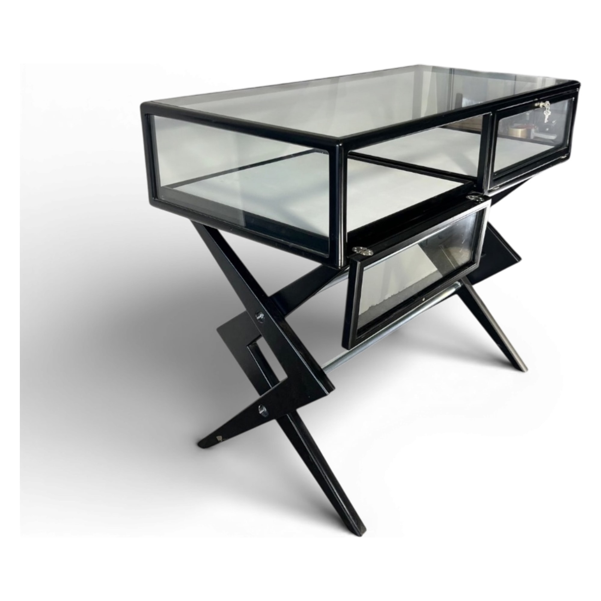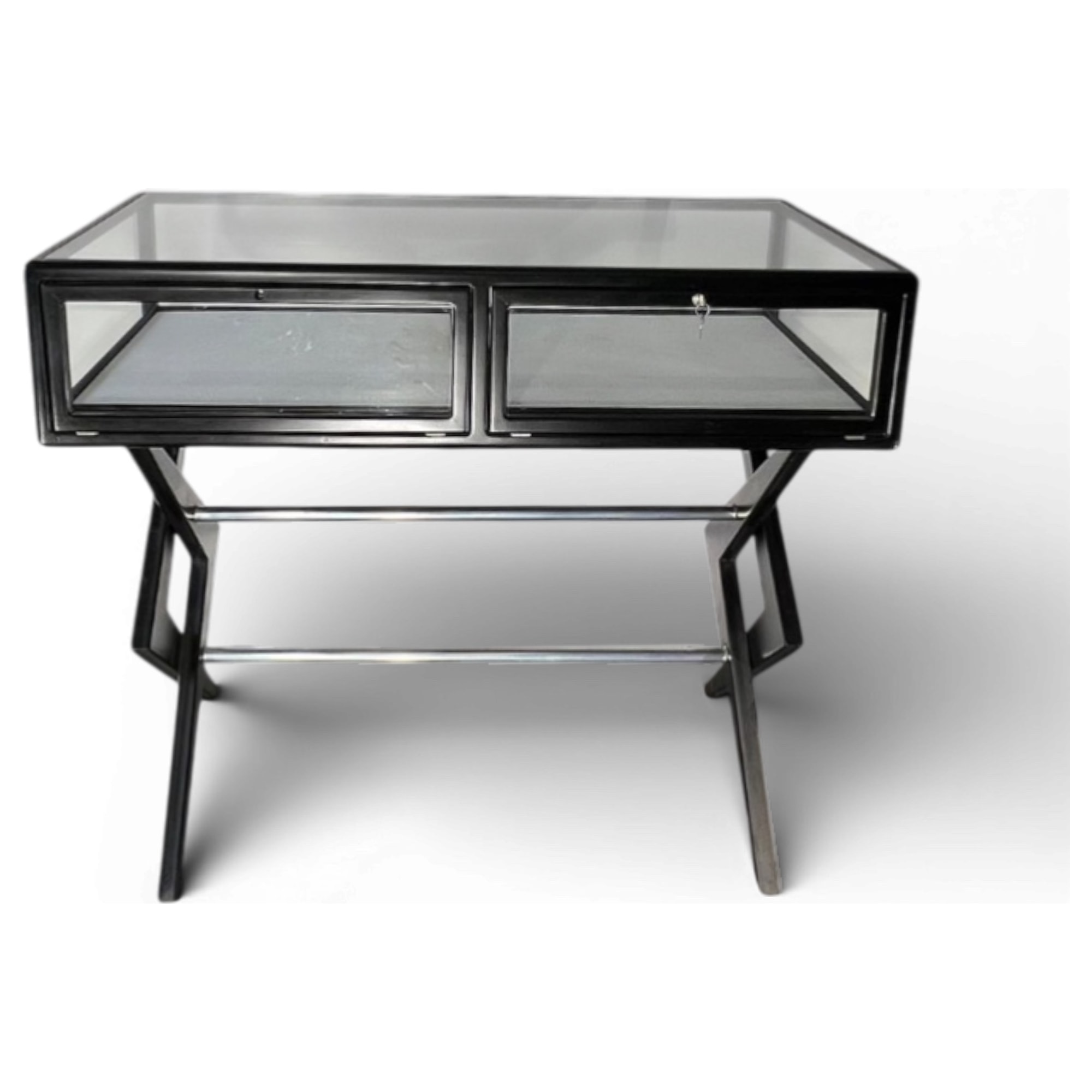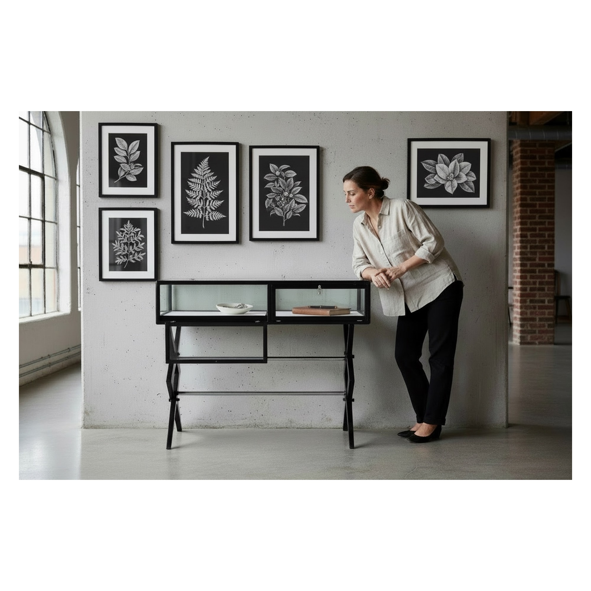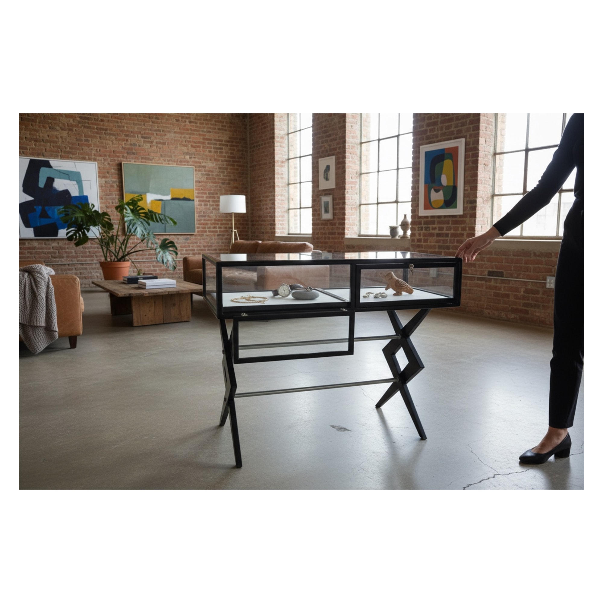 Questa teca da esposizione unisce una struttura metallica con dettagli geometrici alle gambe e un corpo in vetro temperato che richiama le vetrine museali di inizio Novecento. La rotazione a squadra delle gambe non è solo decorativa: era un espediente adottato nei laboratori di orologeria per garantire maggiore stabilità nel tempo. Il vano a doppia anta, di cui una con serratura, permette l’esposizione di oggetti preziosi senza rinunciare all’accessibilità.