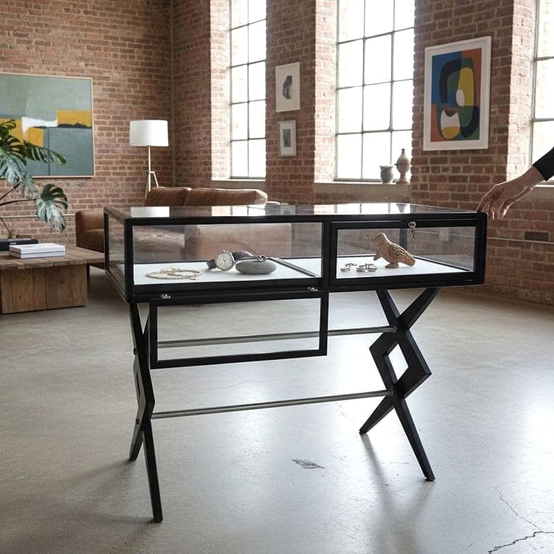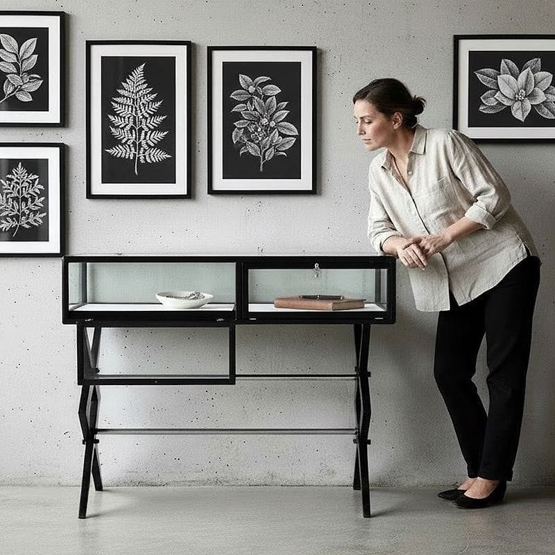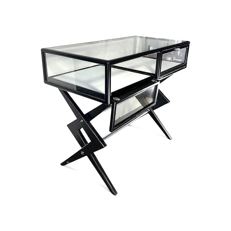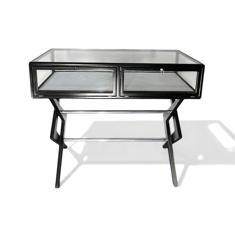 Questa teca da esposizione unisce una struttura in legno verniciato e un corpo in vetro temperato che richiama le vetrine museali di inizio Novecento. La rotazione a squadra delle gambe non è solo decorativa: era un espediente adottato nei laboratori di orologeria per garantire maggiore stabilità nel tempo. Il vano a doppia anta, di cui una con serratura, permette l’esposizione di oggetti preziosi senza rinunciare all’accessibilità.