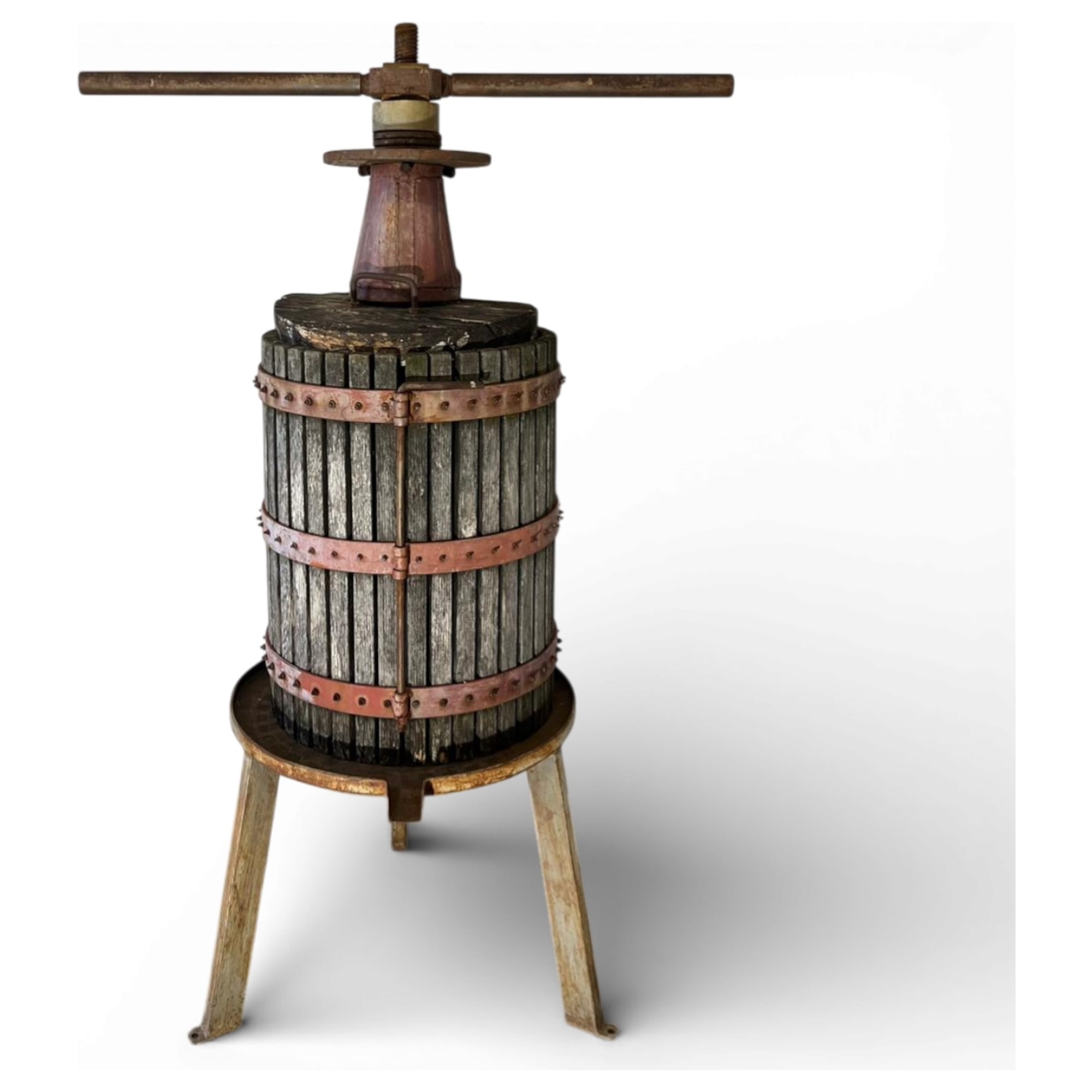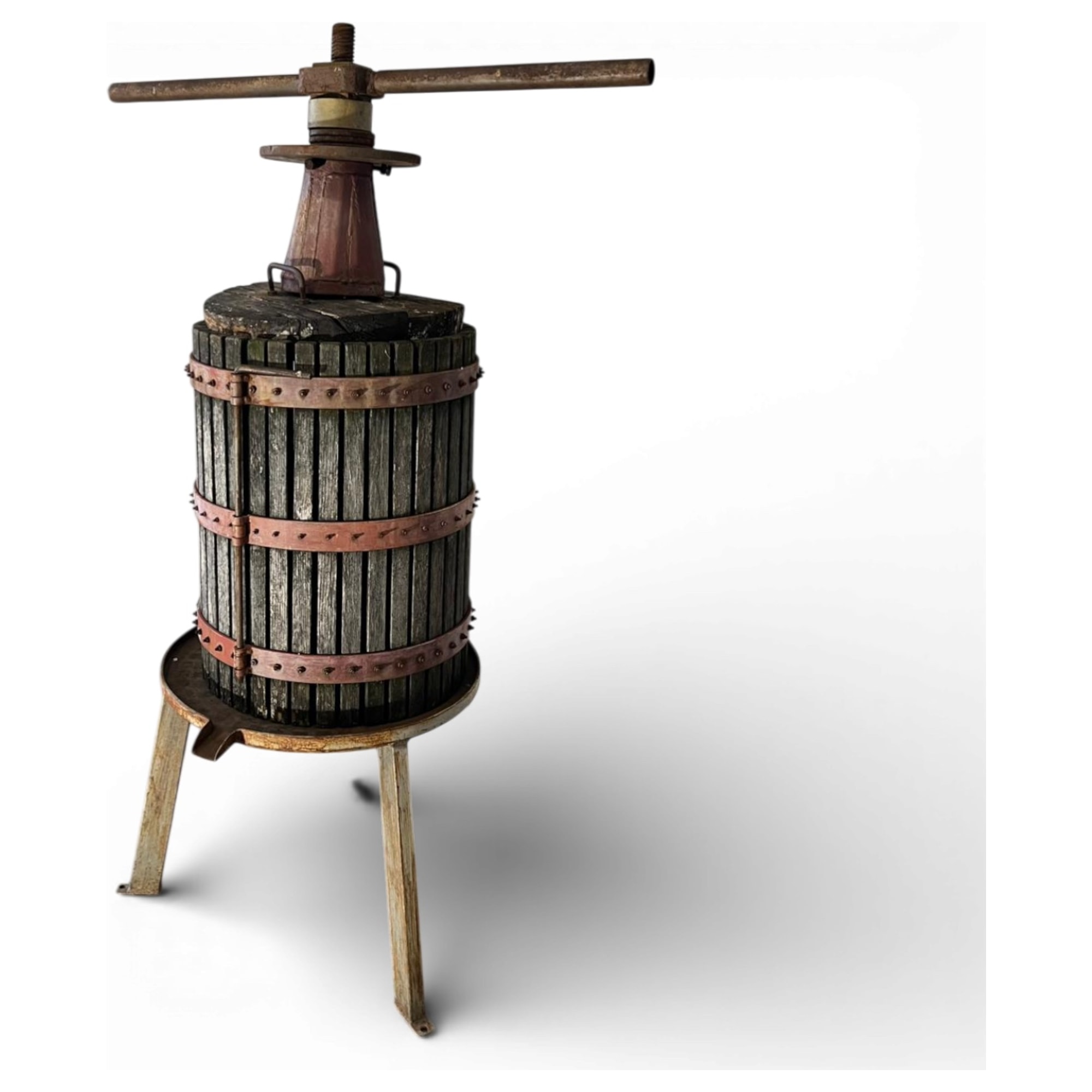 Questo torchio manuale è un autentico manufatto da cantina di fine Ottocento, costruito interamente in legno massello con robuste fasce in ferro battuto e rame per resistere alla poderosa pressione vinaria. La vite centrale in ferro e la particolare scanalatura della base rivelano una raffinata ingegneria contadina: ogni rotazione restituiva forza meccanica sfruttata fino all’ultima goccia. Ancora oggi, i segni lasciati dal mosto sulle doghe narrano storie di vendemmie e di convivialità rurale.