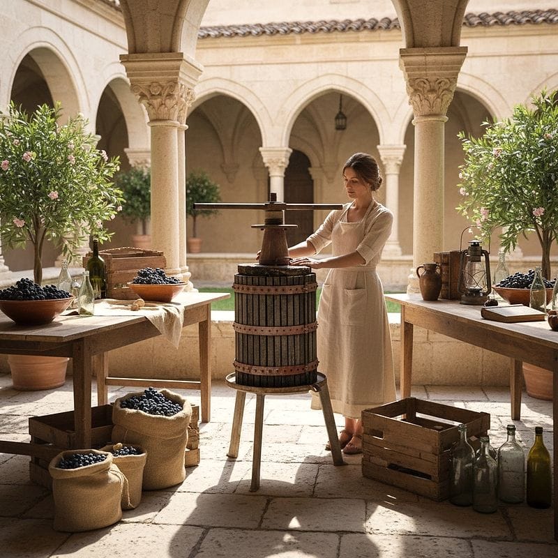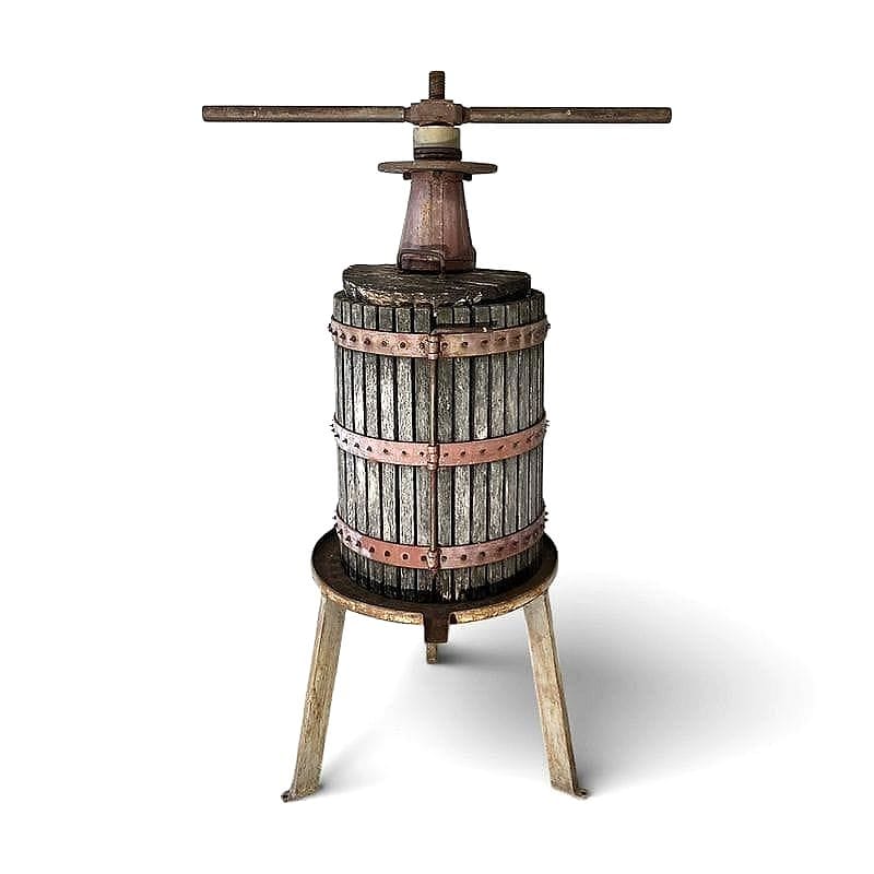 Questo torchio manuale è un autentico manufatto da cantina di fine Ottocento, costruito interamente in legno massello con robuste fasce in ferro battuto e rame per resistere alla poderosa pressione vinaria. La vite centrale in ferro e la particolare scanalatura della base rivelano una raffinata ingegneria contadina. Ancora oggi, i segni lasciati dal mosto sulle doghe narrano storie di vendemmie e di convivialità rurale.