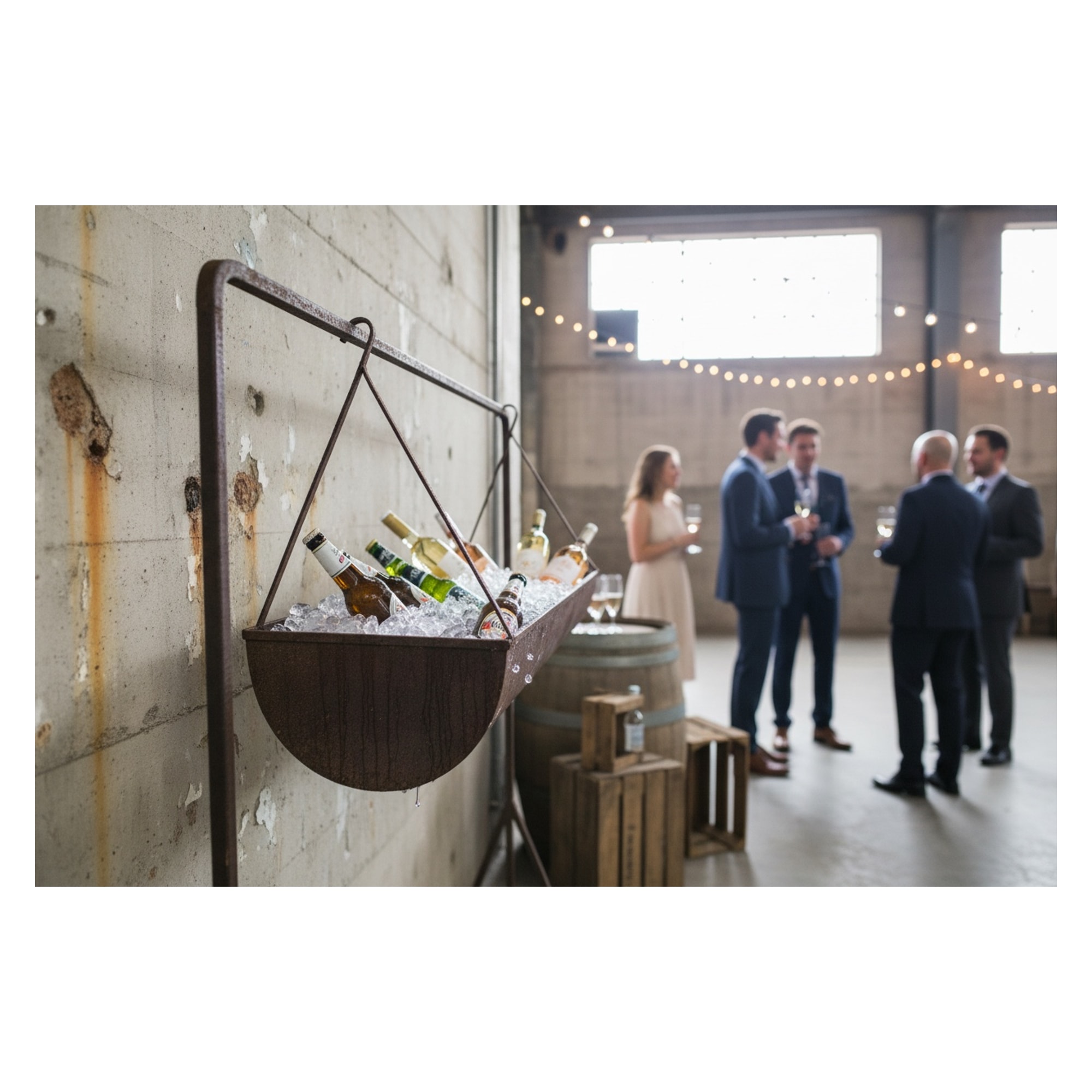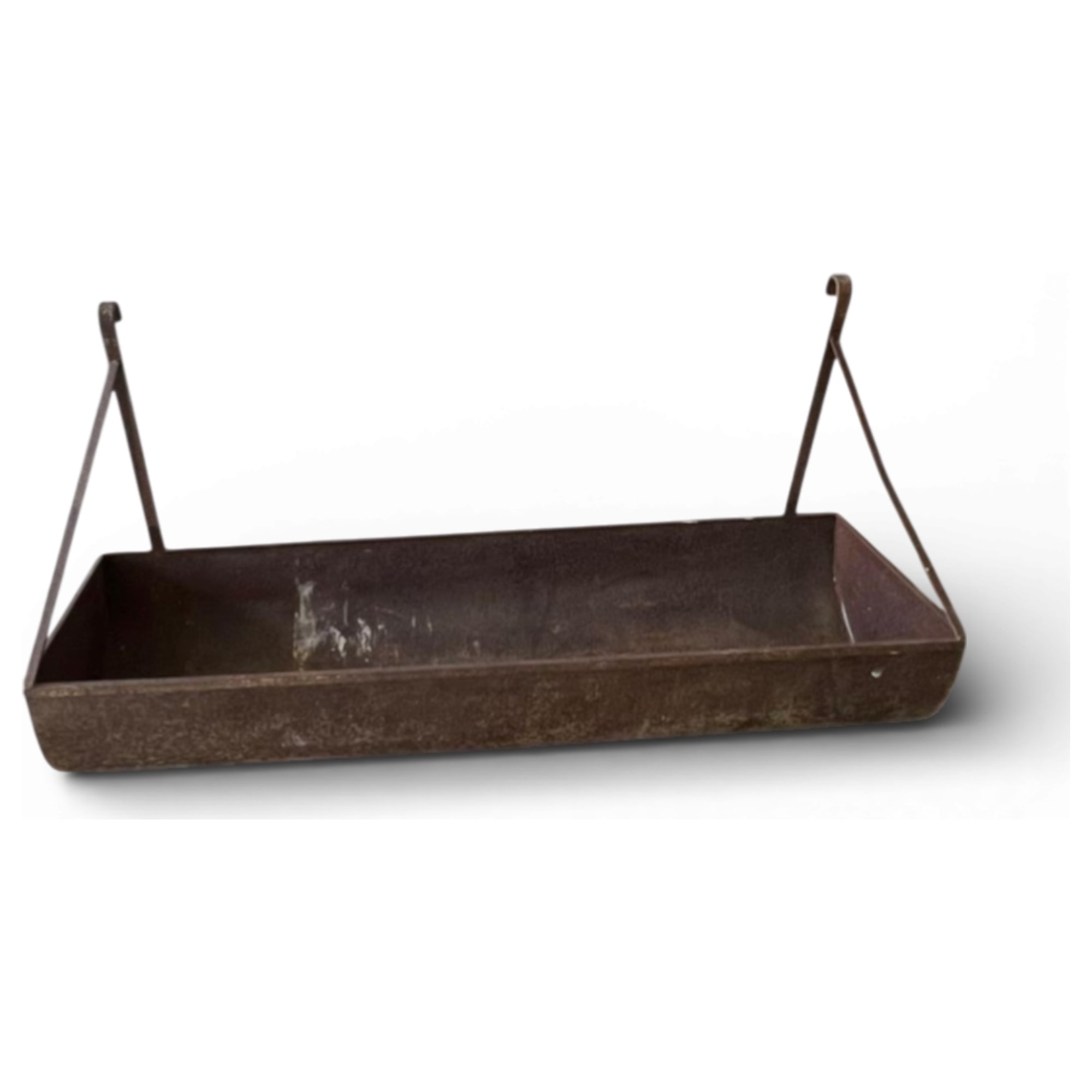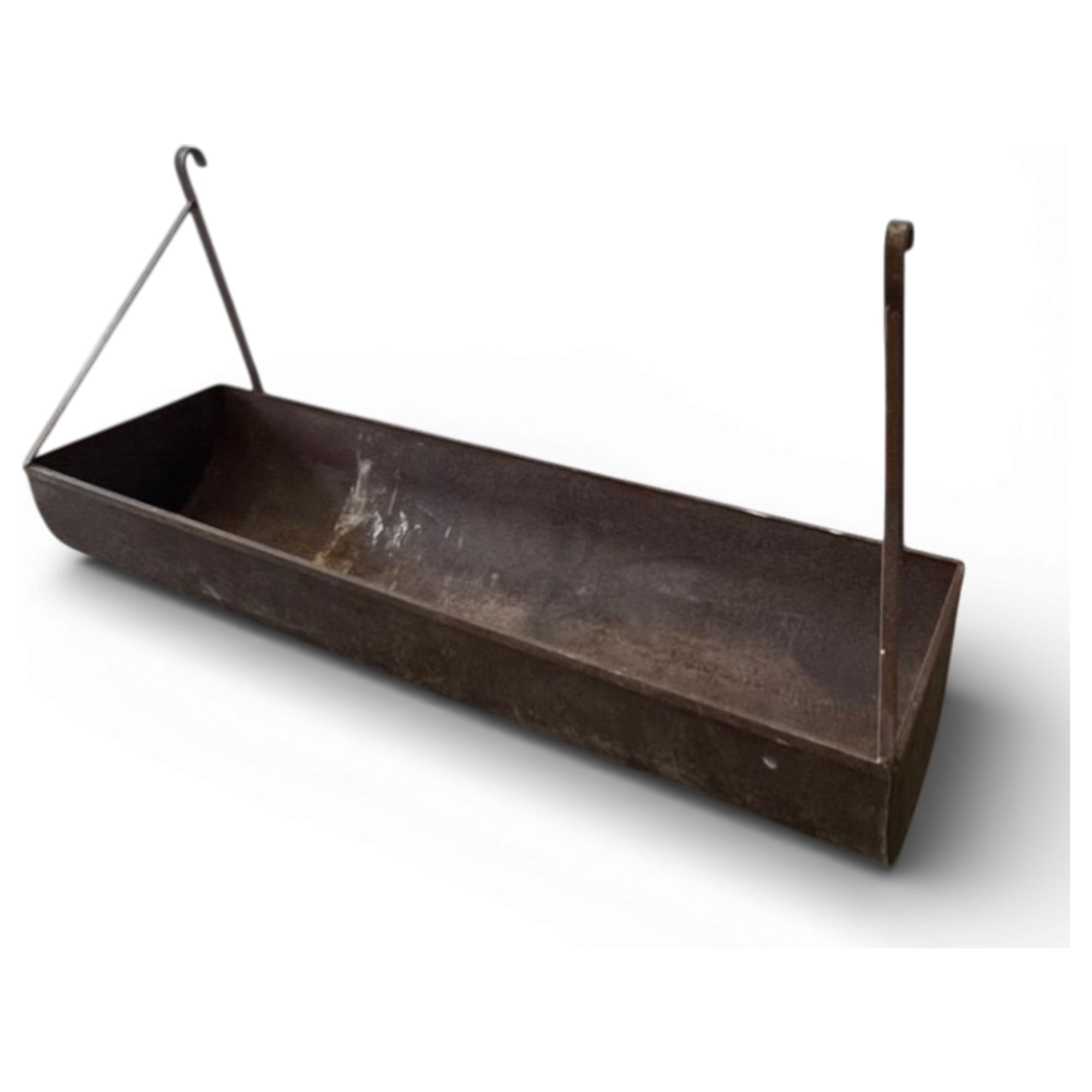 Un raro trough industriale in ferro, originariamente usato come mangiatoia nelle stalle, oggi reinterpretato come glacette scenografica per eventi. La tripla piegatura laterale e i ganci forgiati a mano testimoniano una fabbricazione artigianale pensata per la sospensione anche in ambienti gravosi. Un piccolo segreto: veniva agganciato in alto per evitare che gli animali rovesciassero il contenuto con il muso.