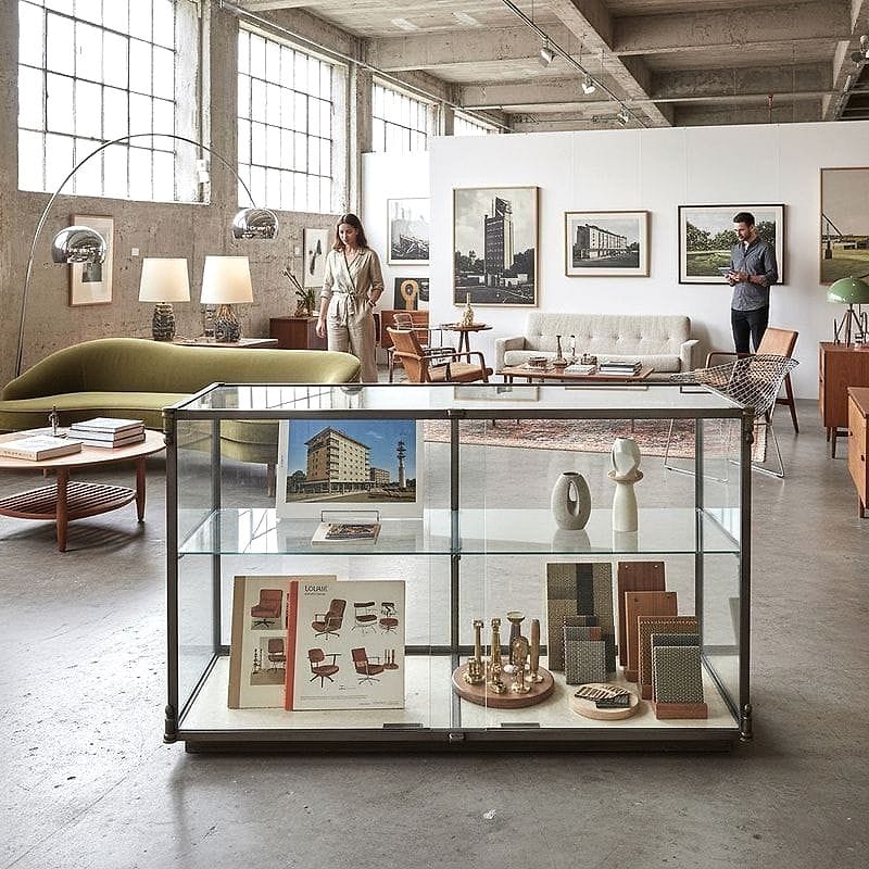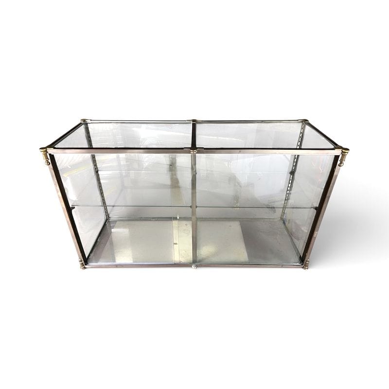 Elegante vetrina industriale in ottone e vetro, storicamente utilizzata in farmacia o gioielleria per la massima visibilità degli oggetti senza ingombrare l’ambiente. Un dettaglio poco noto: i raccordi angolari in ottone massiccio erano spesso realizzati artigianalmente per garantire la tenuta e la pulizia formale delle linee, resistendo all’usura del tempo. I piccoli piedini sferici sono pensati per non lasciare tracce sul parquet storico, un accorgimento raro nei modelli della stessa epoca. Valore crescente per la qualità delle lavorazioni manuali e la sopravvivenza in ambienti civilizzati.