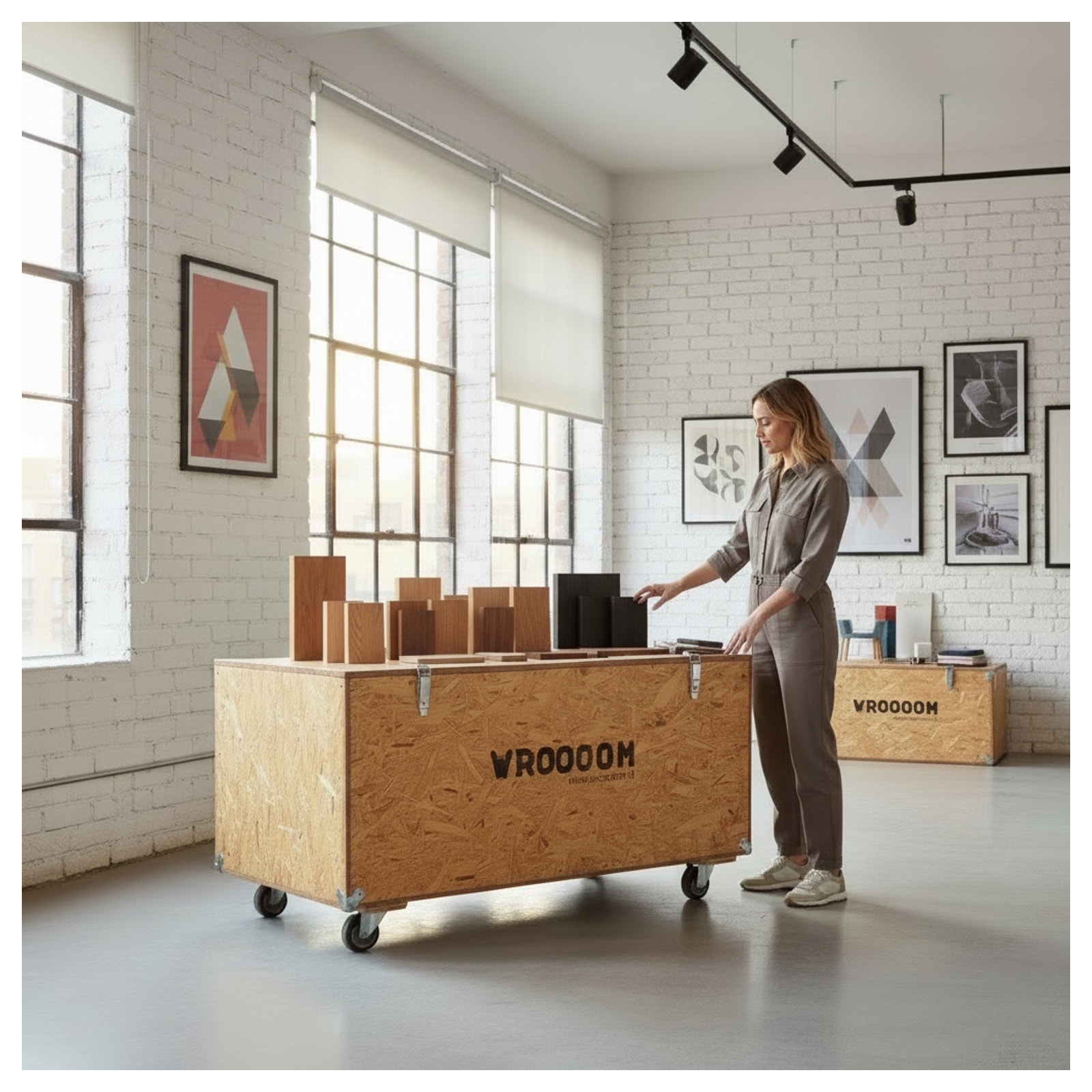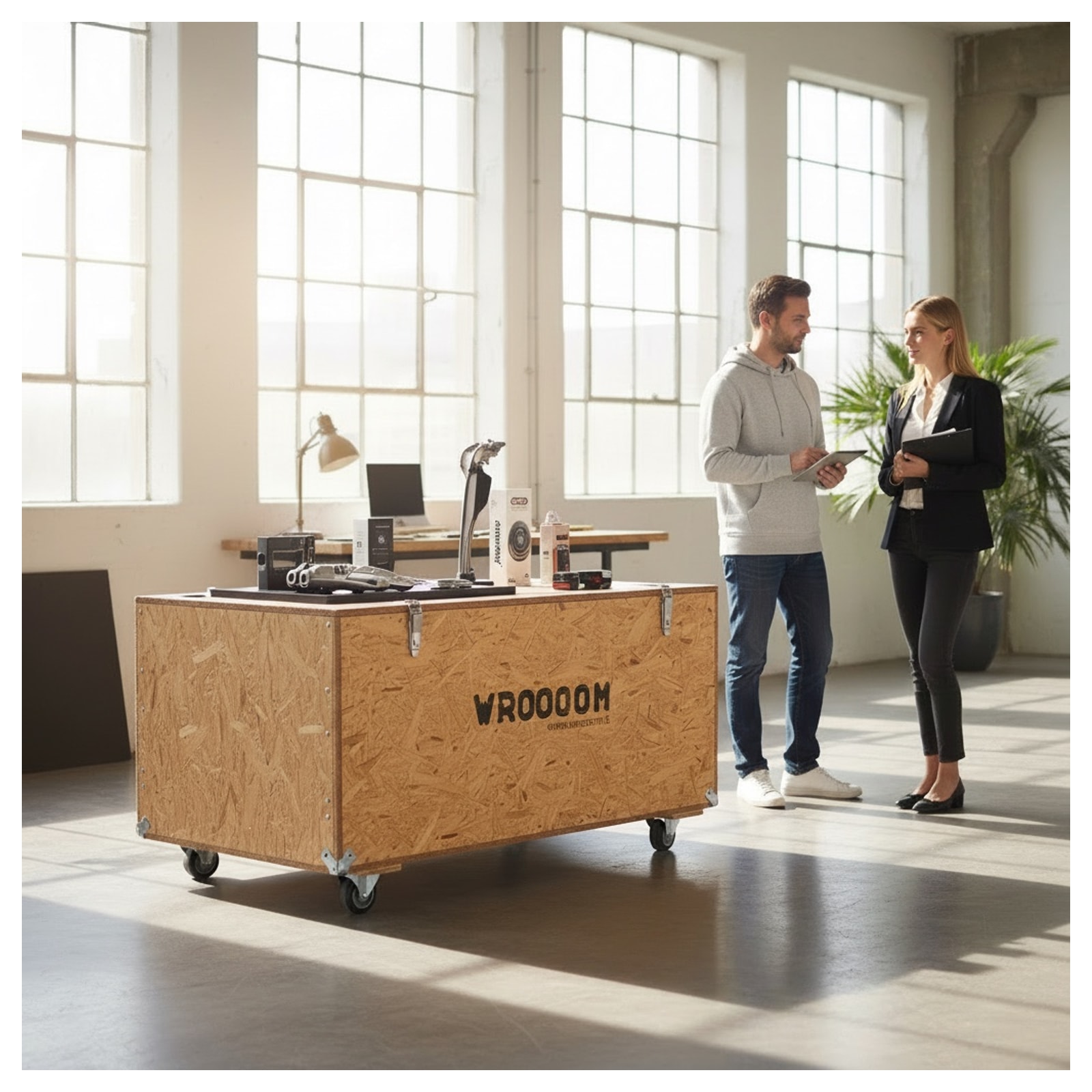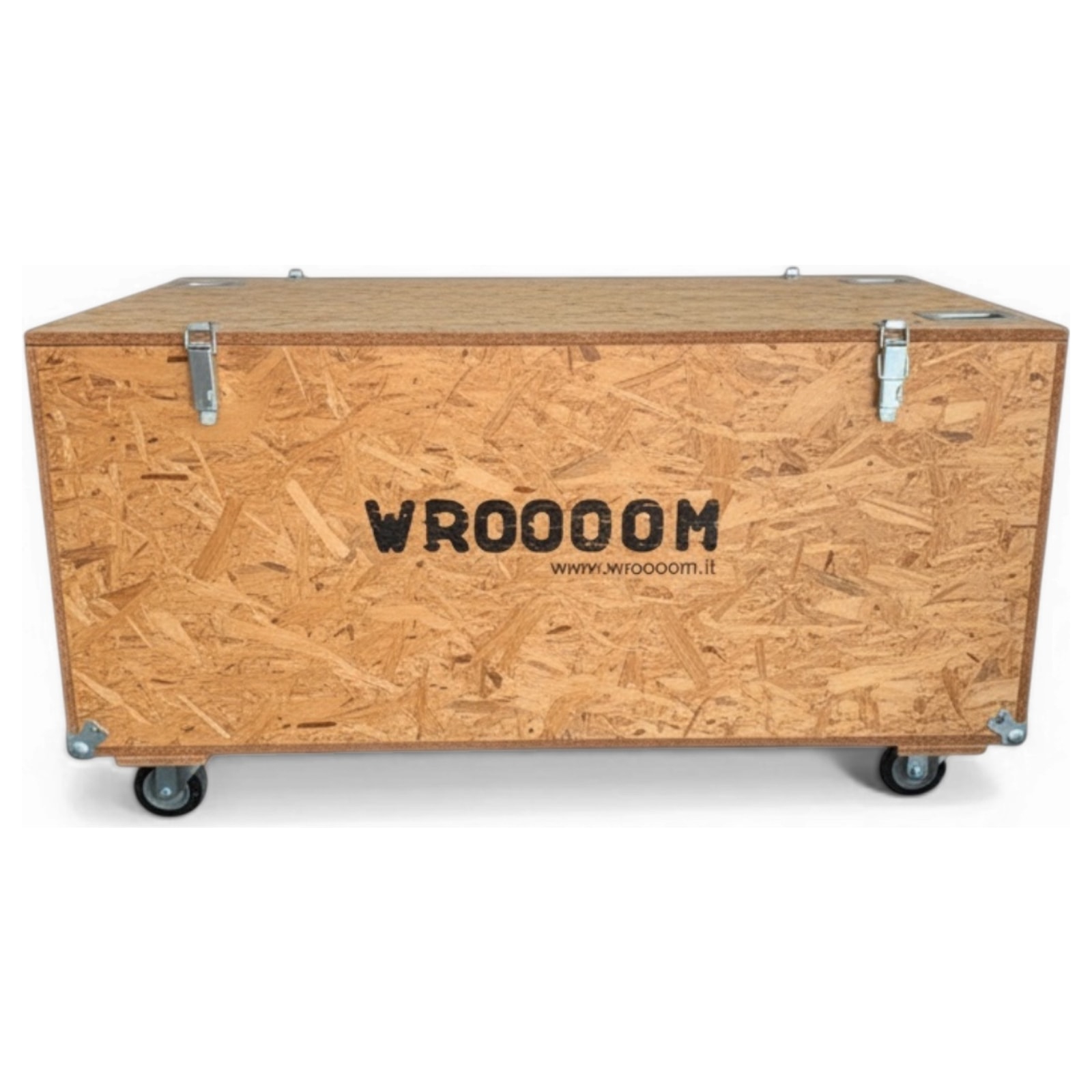 Questa robusta cassa su ruote nasce come contenitore per fiere e trasporti, ma molti la reinterpretano come banco espositivo o arredo industriale. I pannelli OSB esposti raccontano una precisa scelta materica, fondata sull’estetica della funzionalità. I dettagli metallici richiamano le piccole serie artigianali destinate a logistica e allestimento, e il logo WROOOOM tramanda la sua origine di oggetto migrante e multitasking.