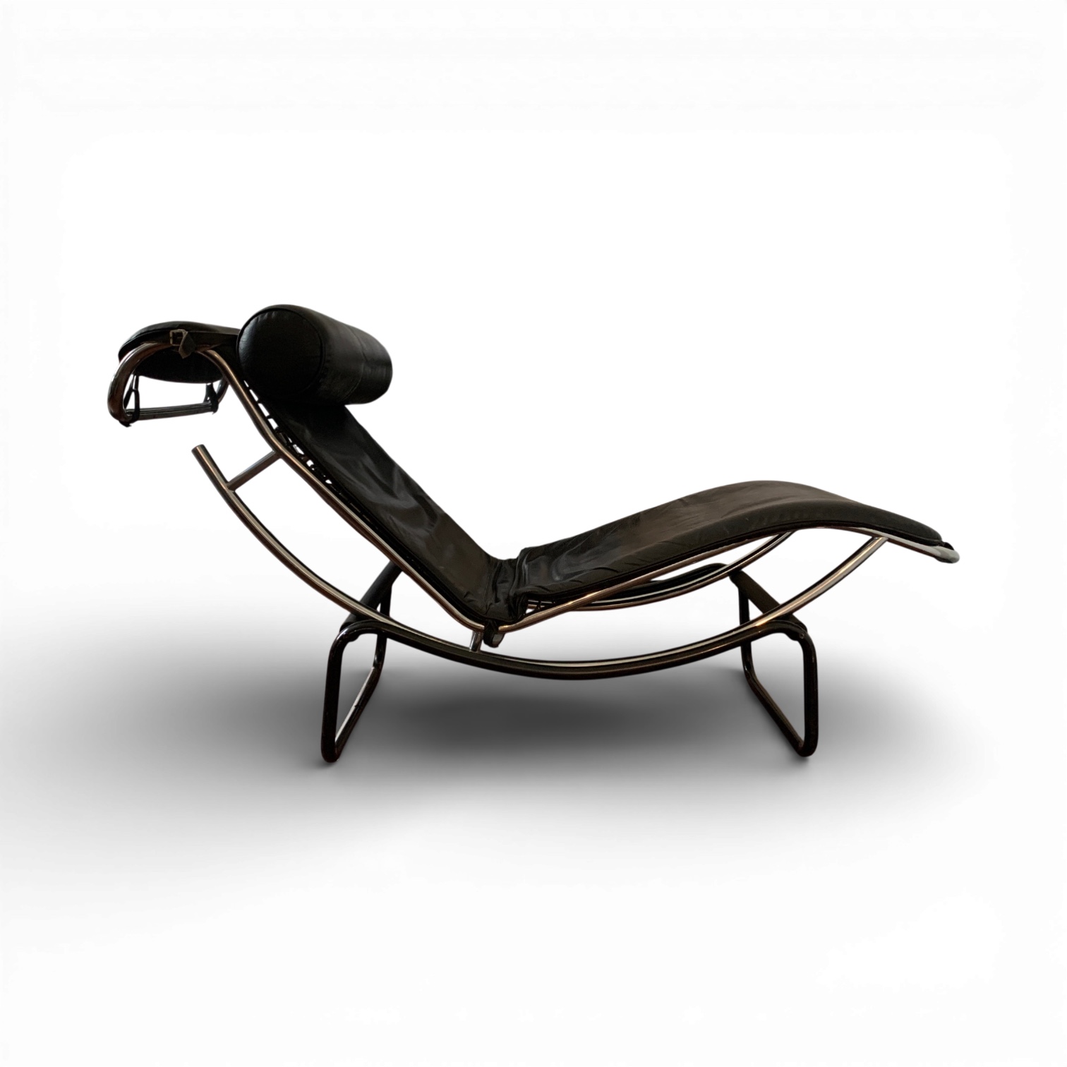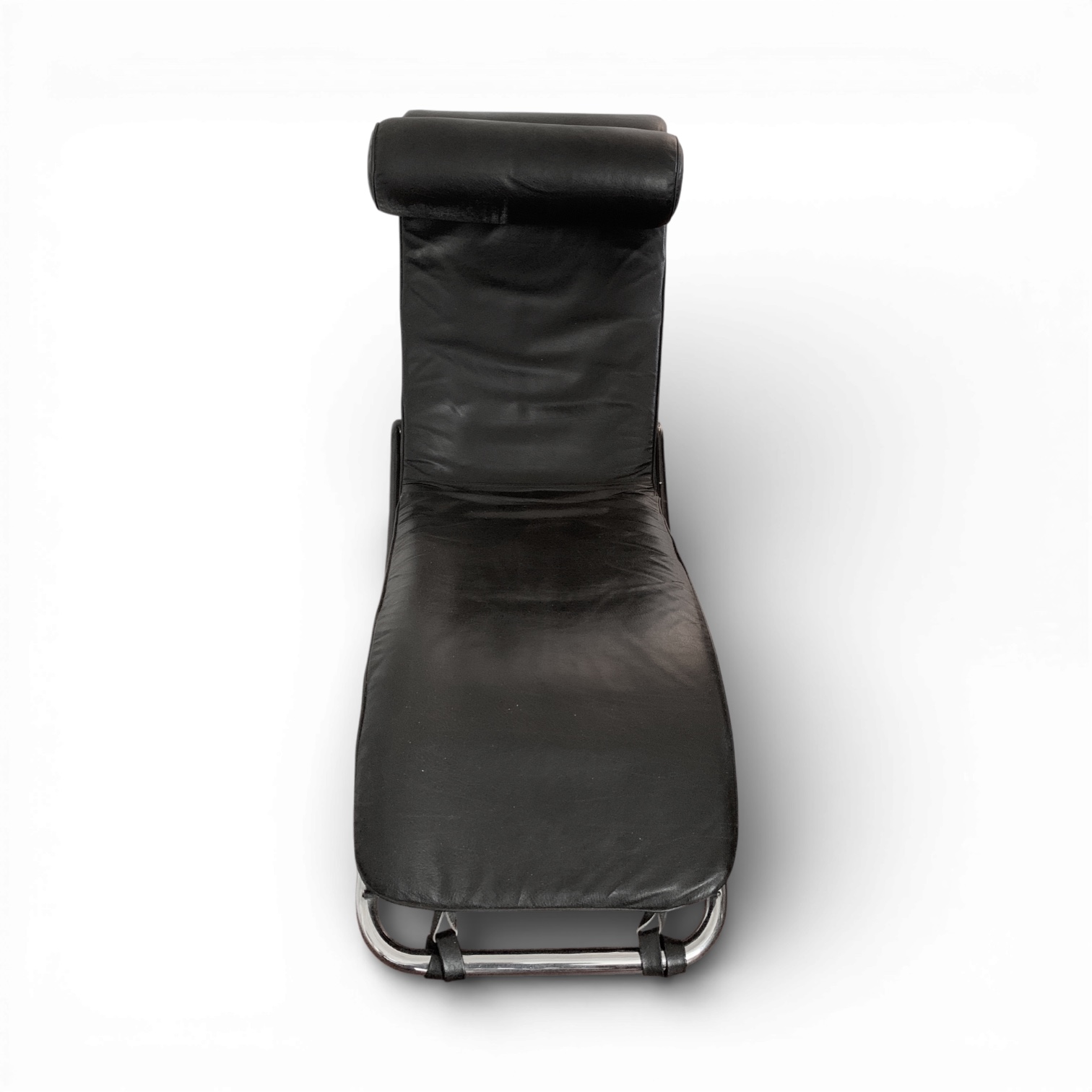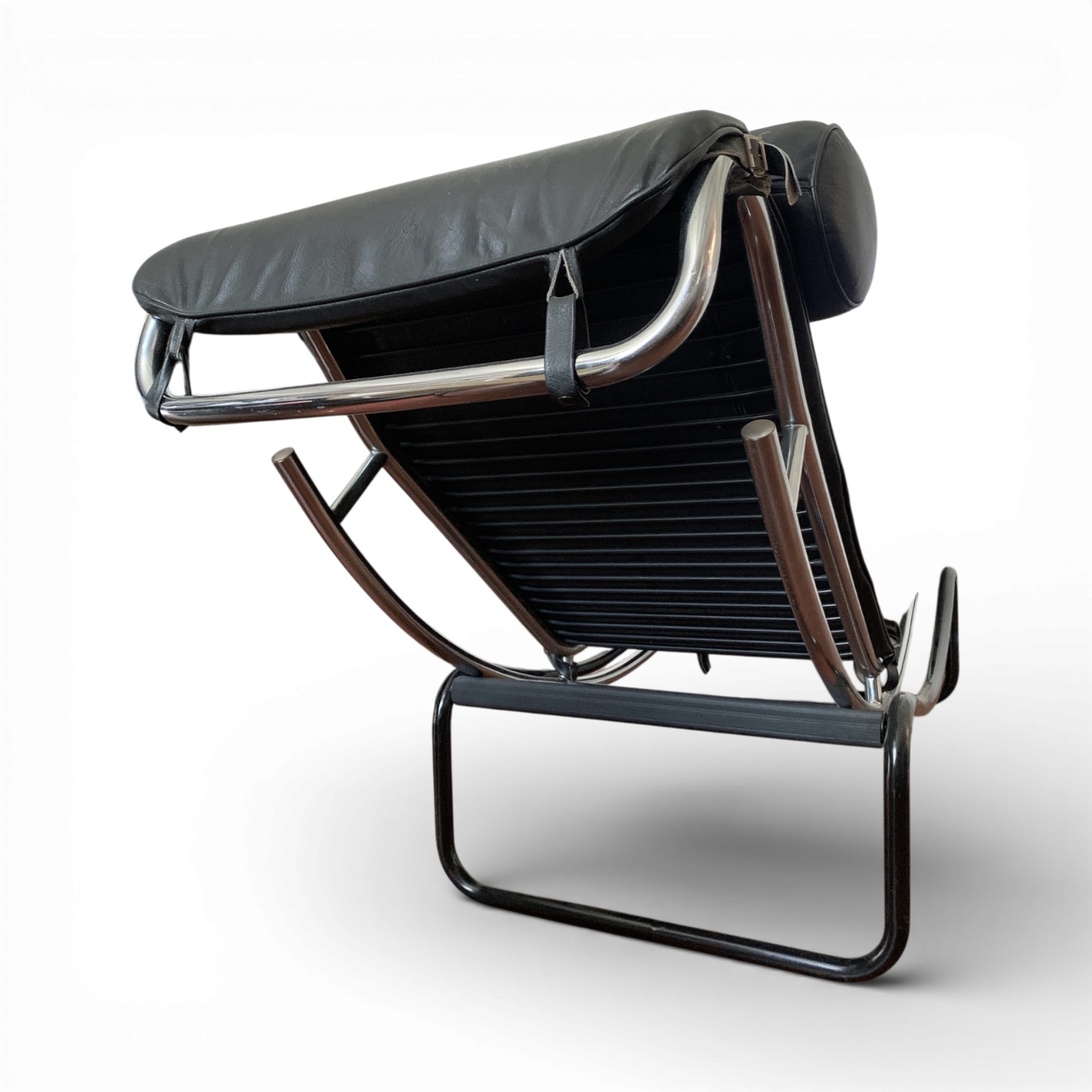 La struttura a doppia curvatura di questo chaise longue richiama l’ossessione anni ‘70 per l’equilibrio visivo e la sospensione del corpo. Degno di nota il sistema elastico a cinghie che sostiene la seduta, pensato per adattarsi perfettamente alle forme del corpo. Il profilo tubolare integra elegantemente la poggiatesta cilindrica, suggerendo una continuità stilistica tipica della produzione europea del periodo.