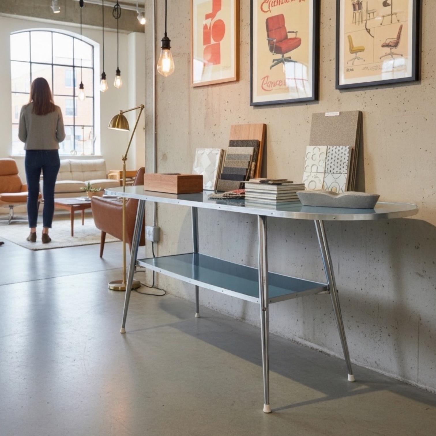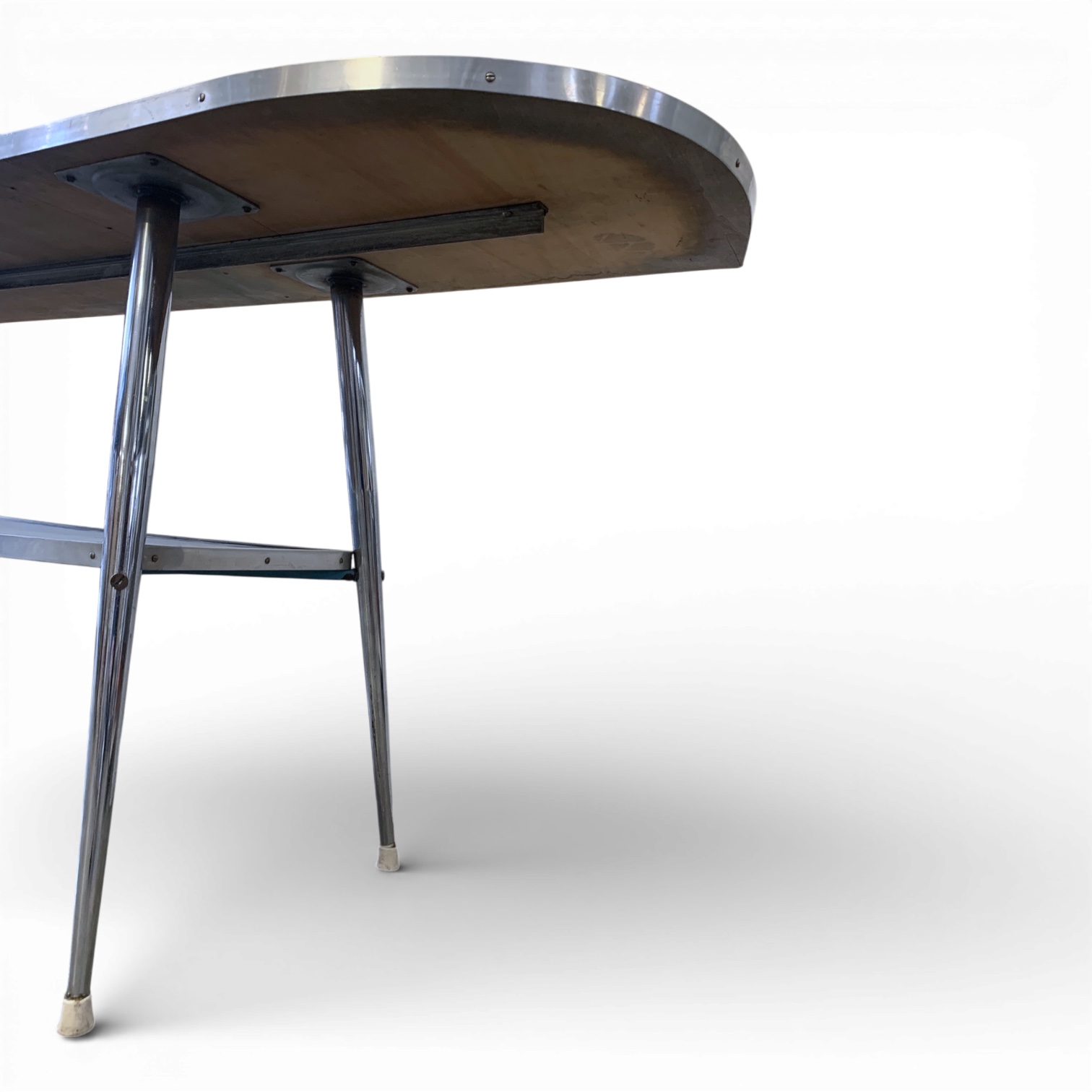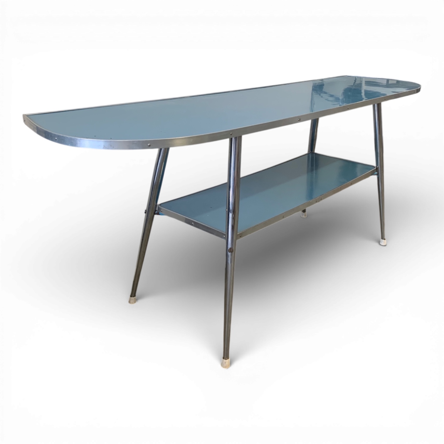 Questa consolle presenta due ripiani in formica sostenuti da una struttura in metallo cromato. Curiosa la rifinitura con viti a vista e piedini in bachelite, raro dettaglio tecnico degli anni '50.