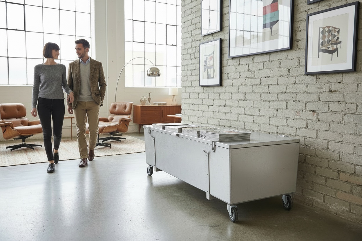 - Tipico contenitore italiano per cantieri e logistica ferroviaria degli anni '90; divenuto arredo di tendenza in contesto post-industriale dal 2015, spesso impiegato in allestimenti retail o interni loft come mobile TV, cassapanca, contenitore