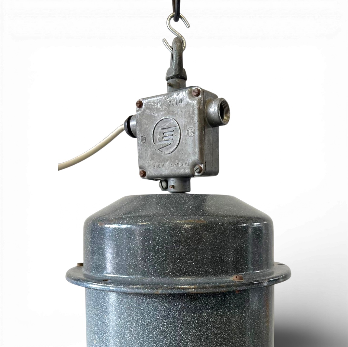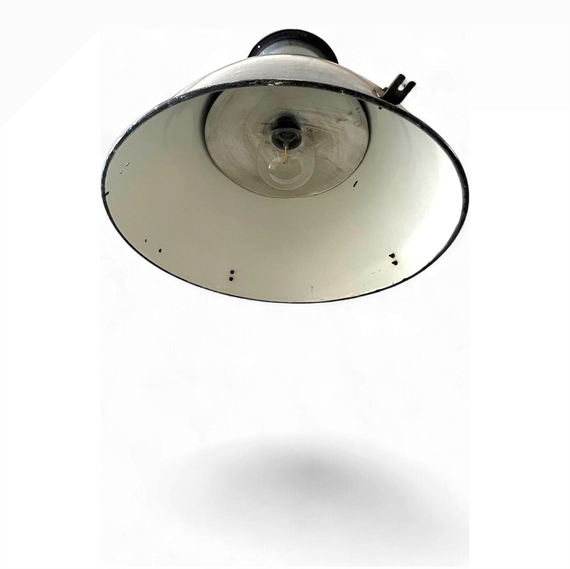 Autentica lampada industriale smaltata, recuperata da vecchie fabbriche europee. Il piccolo dettaglio sorprendente è l'isolatore elettrico in ceramica all'interno del portalampada, pensato per resistere a lunghi anni di utilizzo continuo. Questo modello veniva spesso scelto per la sua resistenza alle alte temperature e ai solventi, un tratto raro nei pezzi prodotti dopo il boom economico. L'interno bianco riflettente massimizza la diffusione luminosa, segno di un'attenta progettazione tecnica.