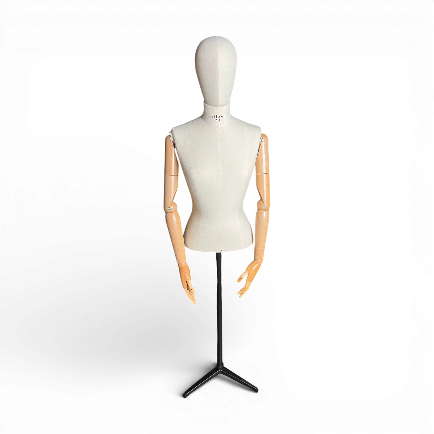 Questo manichino sartoriale degli anni '50 vanta braccia snodate in legno che consentivano ai couturier di simulare i movimenti del corpo durante la progettazione degli abiti. Il torso è realizzato in tela robusta, ancora oggi piacevole al tatto. Nei grandi atelier dell’epoca era frequente vedere modelli simili adottati per mostre o vetrine, proprio grazie alla versatilità degli arti articolati.