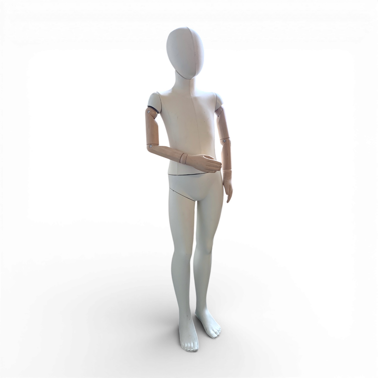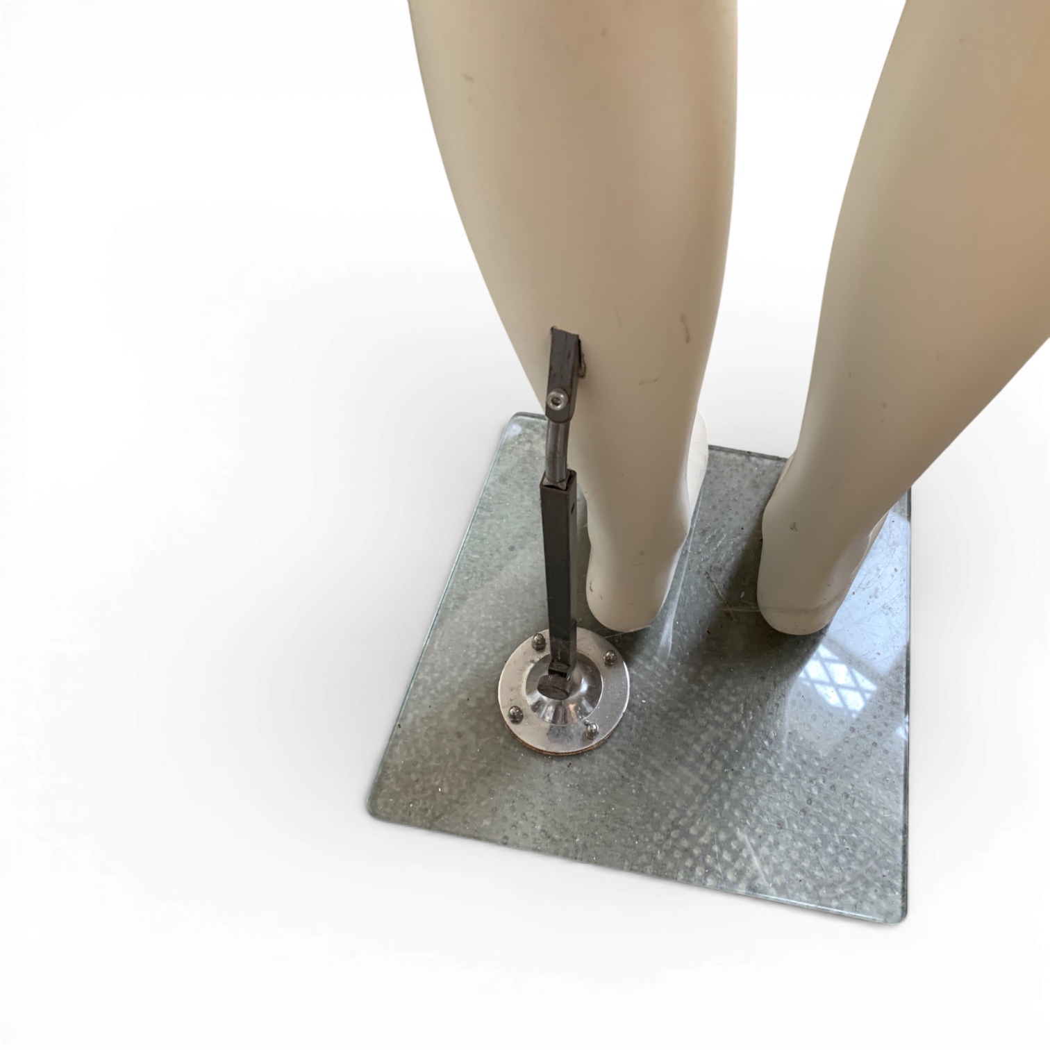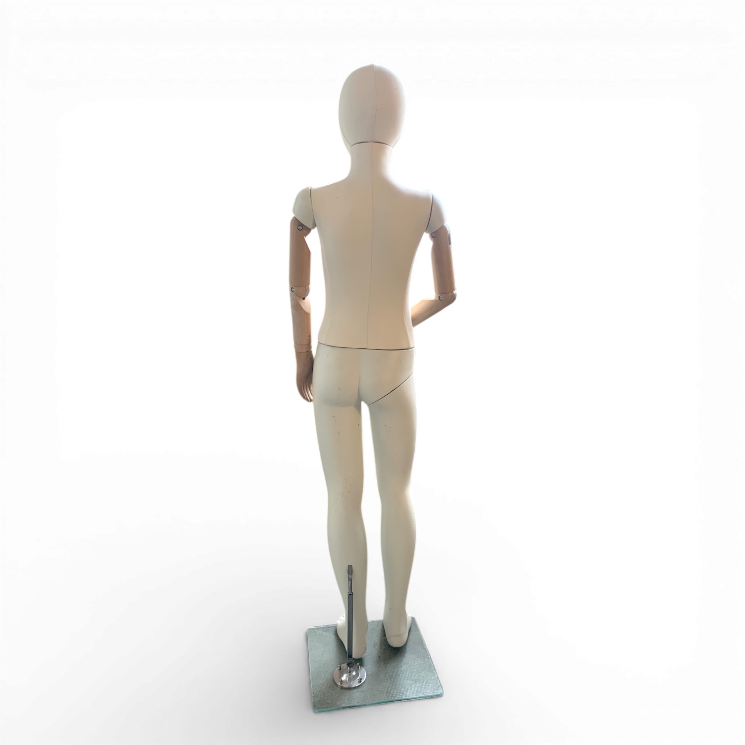 Questo raro manichino sartoriale da bambino spicca per le braccia in legno snodate, dettaglio tecnico che lo rende particolarmente ricercato tra gli allestitori vintage. La base in vetro con attacco regolabile testimonia una produzione attenta alla stabilità e alla versatilità espositiva.