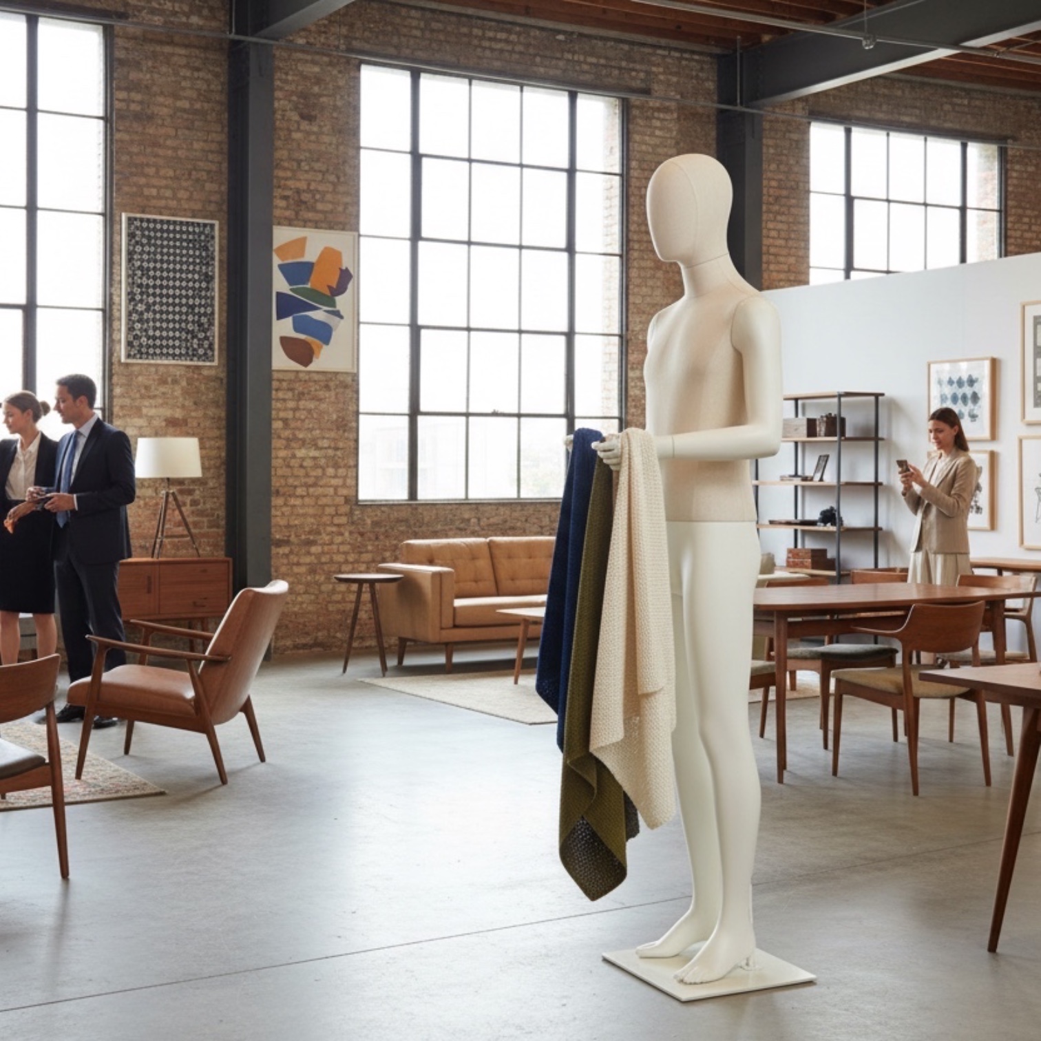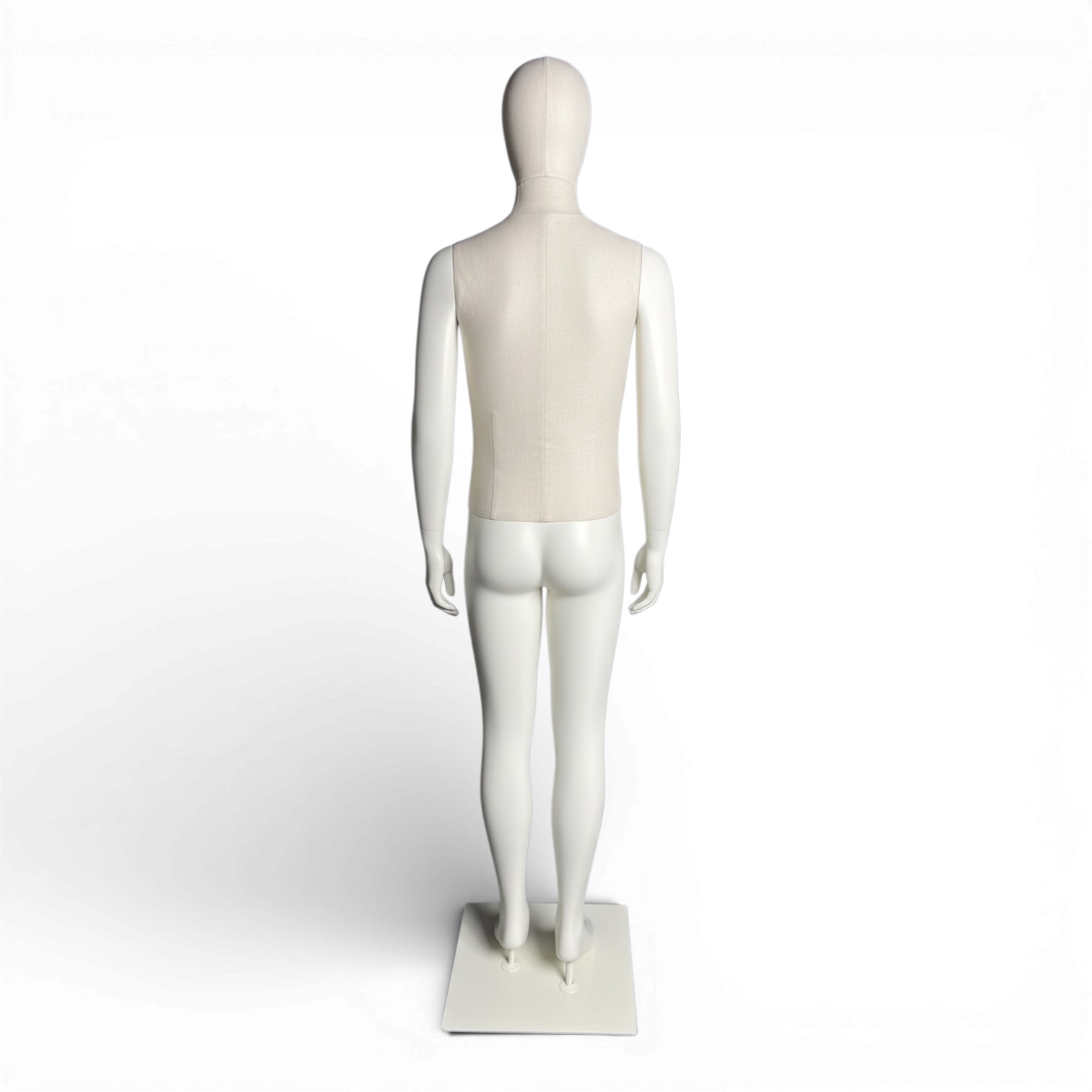 Curioso manichino maschile vintage con busto e testa rivestiti in tessuto chiaro, soluzione tipica degli atelier di alta sartoria degli anni ‘70 per evitare transfer di colore sui capi esposti. Il contrasto tattile tra la finitura opaca del corpo e la superficie materica del tessuto suggerisce una doppia funzione: sia supporto espositivo che oggetto di studio per modellistica. Da notare la base smontabile che lo rende particolarmente pratico in contesti dinamici.