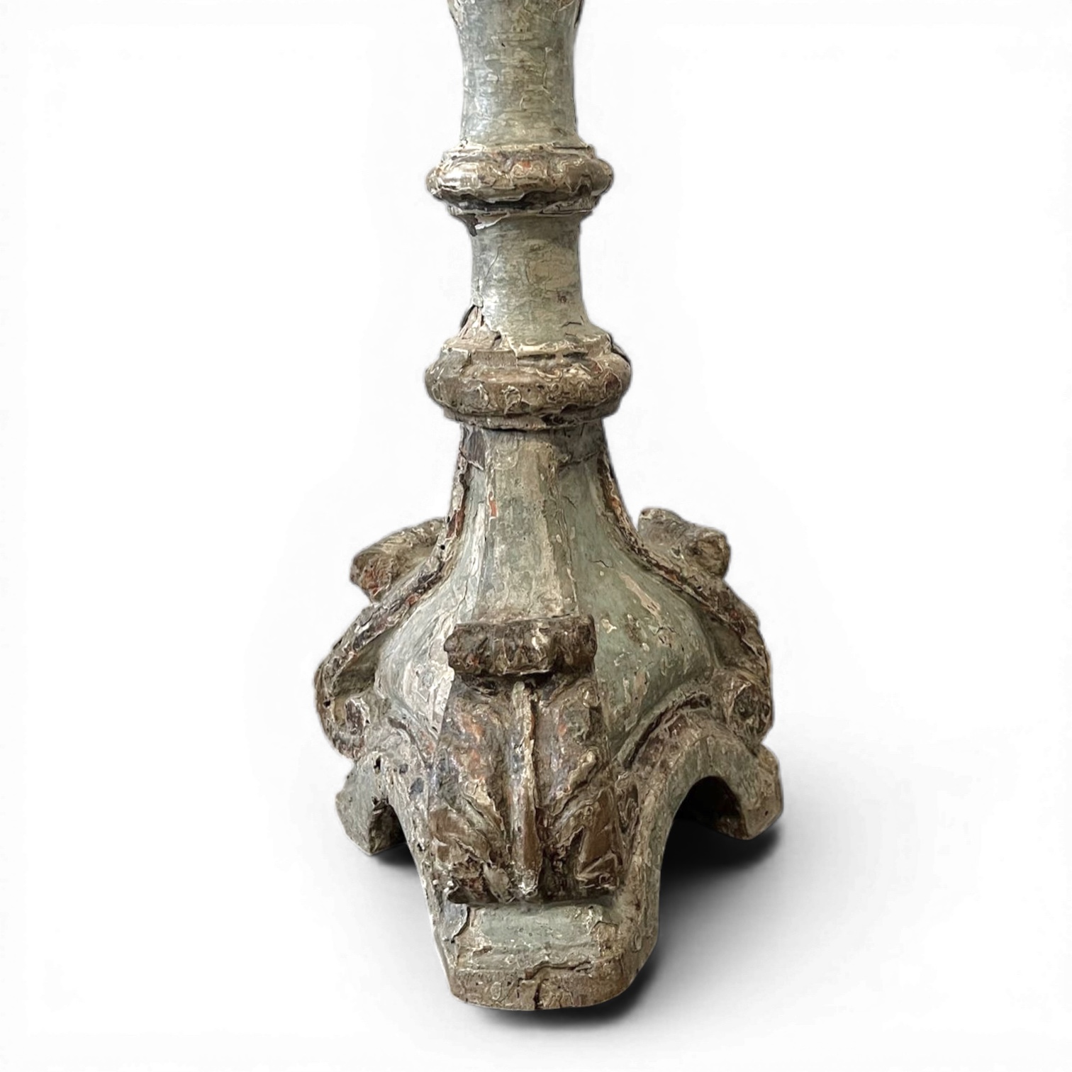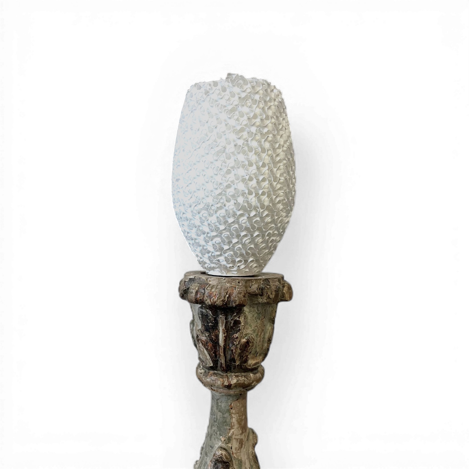 Questa piantana nasce dall'inedito accostamento tra una base barocca lignea e un paralume in PLA stampato. Un curioso mix assieme alla base, probabilmente nata come grande torciere ecclesiastico, porta ancora tracce di policromia settecentesca sotto le successive mani di pittura.