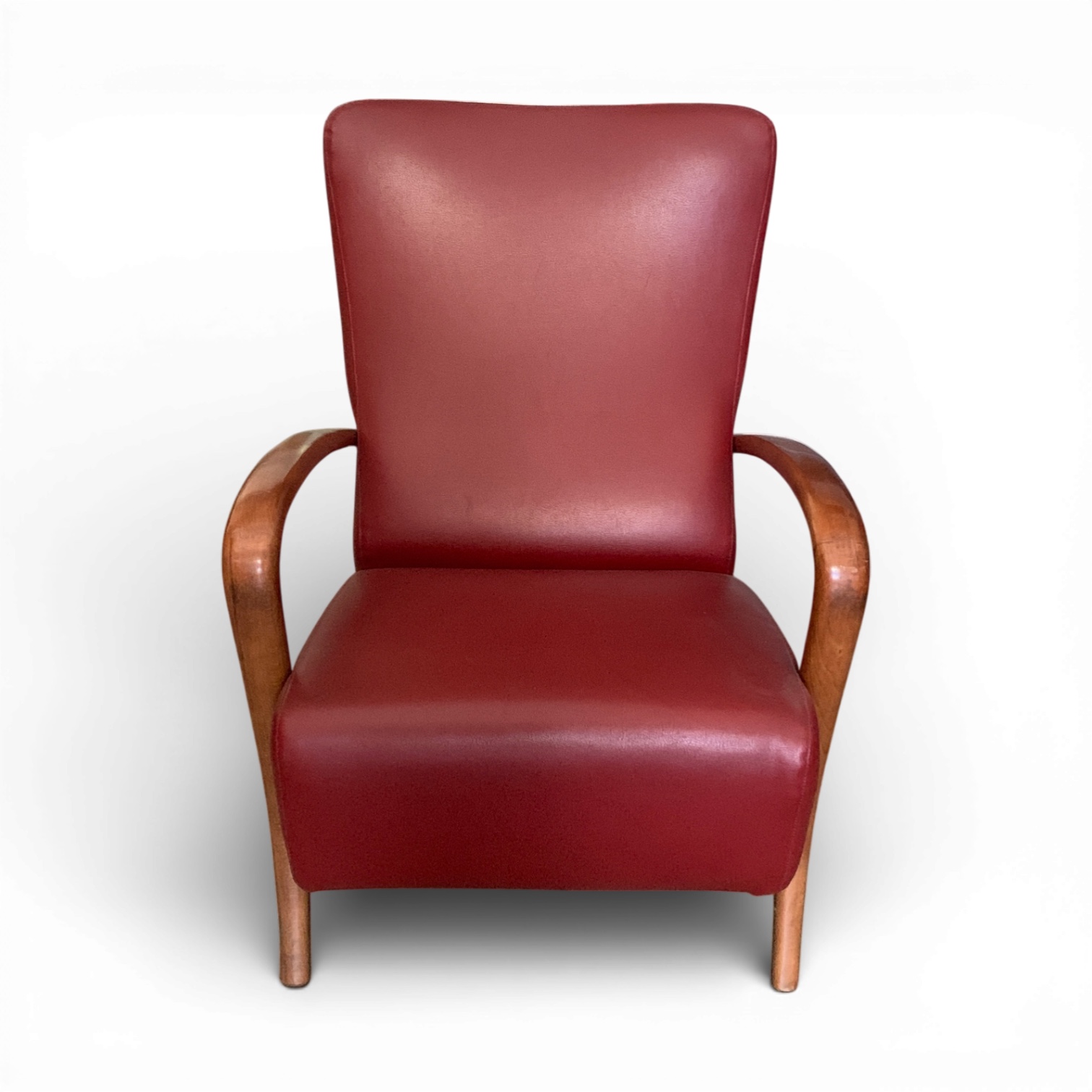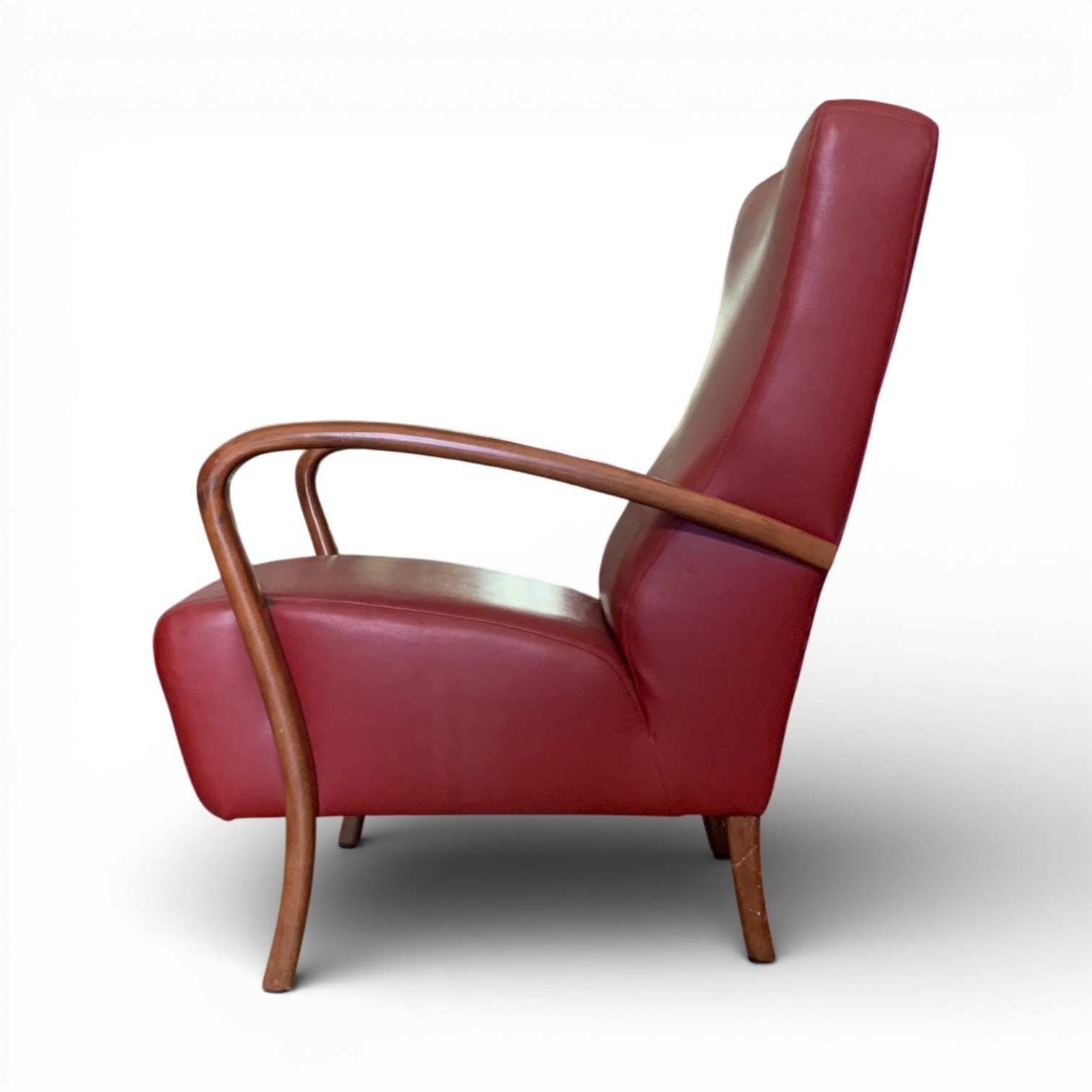 poltrona anni cinquanta in vinile rosso e faggio curvato