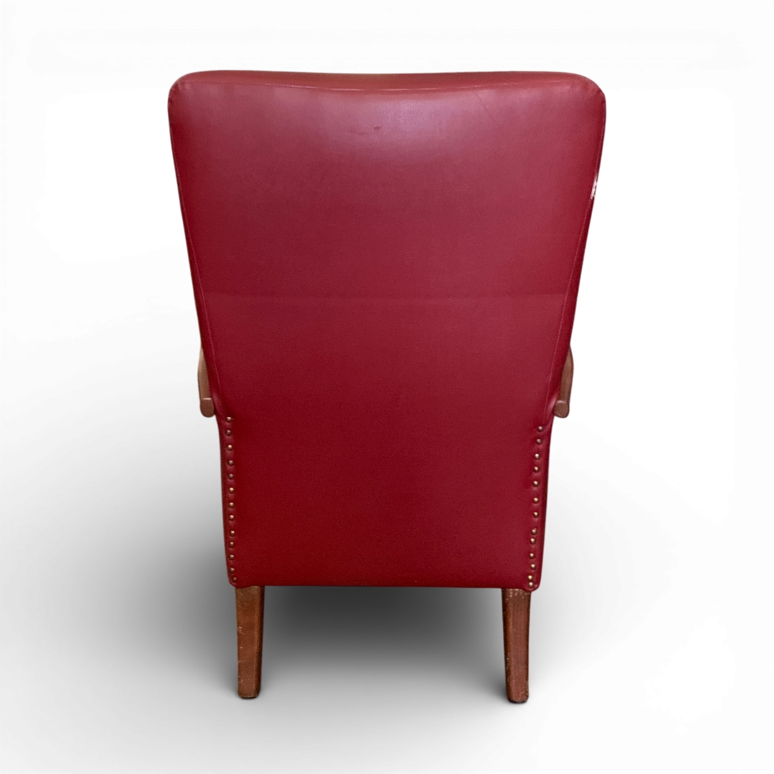 Questa poltrona fonde il carattere vivace del vinile rosso con il faggio curvato a vapore, una tecnica che nei primi anni '50 era ancora riservata a produzioni semi-artigianali. L’andamento sinuoso dei braccioli richiama il gusto per la plasticità propria del dopoguerra italiano. Un dettaglio curioso: la chiodatura posteriore visibile testimonia una lavorazione autentica dell’epoca.
