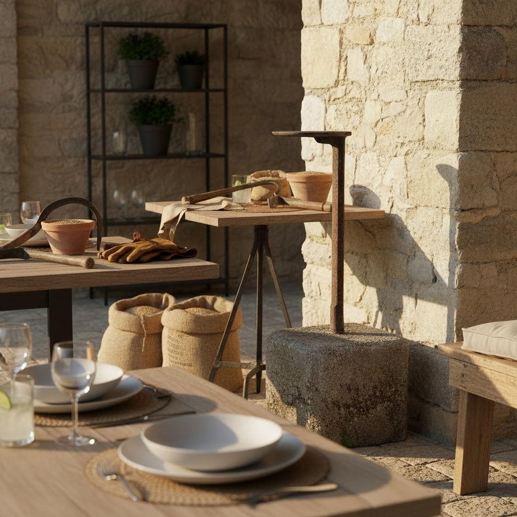 Raro esempio di recupero industriale anni '60, questo tavolino nasce dall’assemblaggio di una base in cemento grezzo e un palo in ferro riciclato. La parte superiore richiama la pala di una vecchia macchina agricola, riadattata a vassoio con margini irregolari. Il dettaglio più curioso: la stratificazione di ruggine naturale è stata lasciata intatta, a testimonianza del tempo e della vocazione brutalista dell’oggetto.