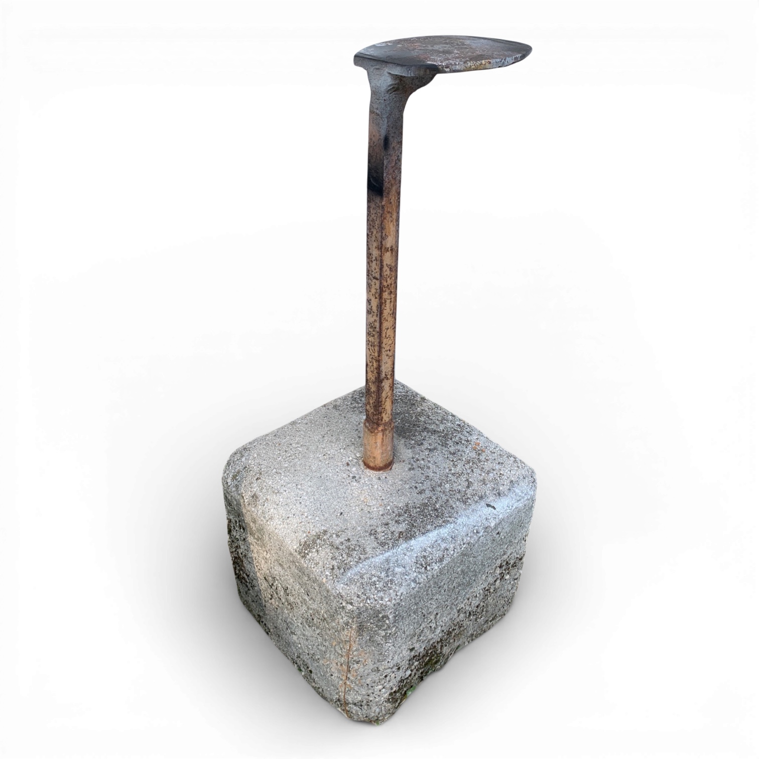 - base in cemento grezzo, palo in ferro industriale riciclato, piano superiore in metallo originale riadattato (pala di macchina agricola)