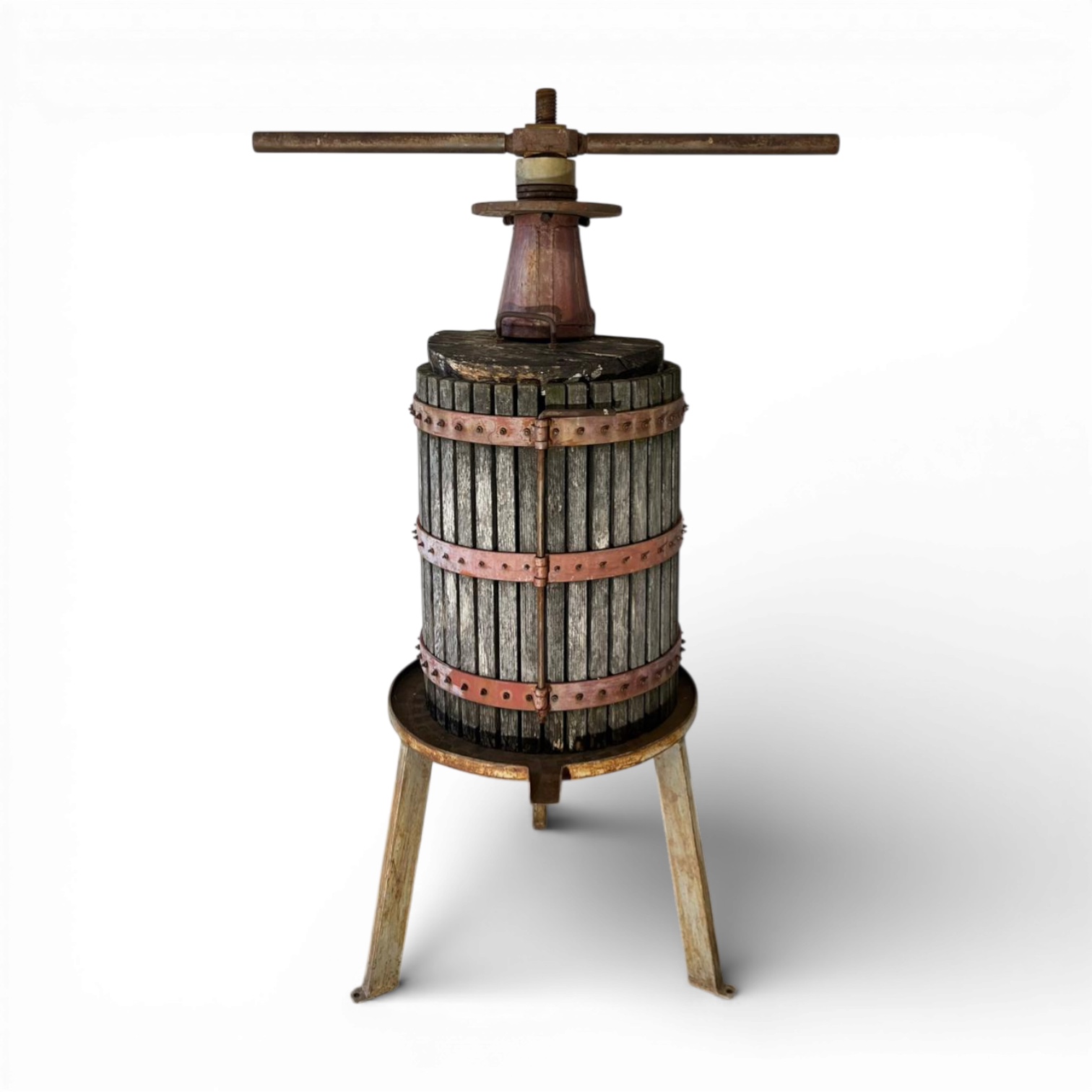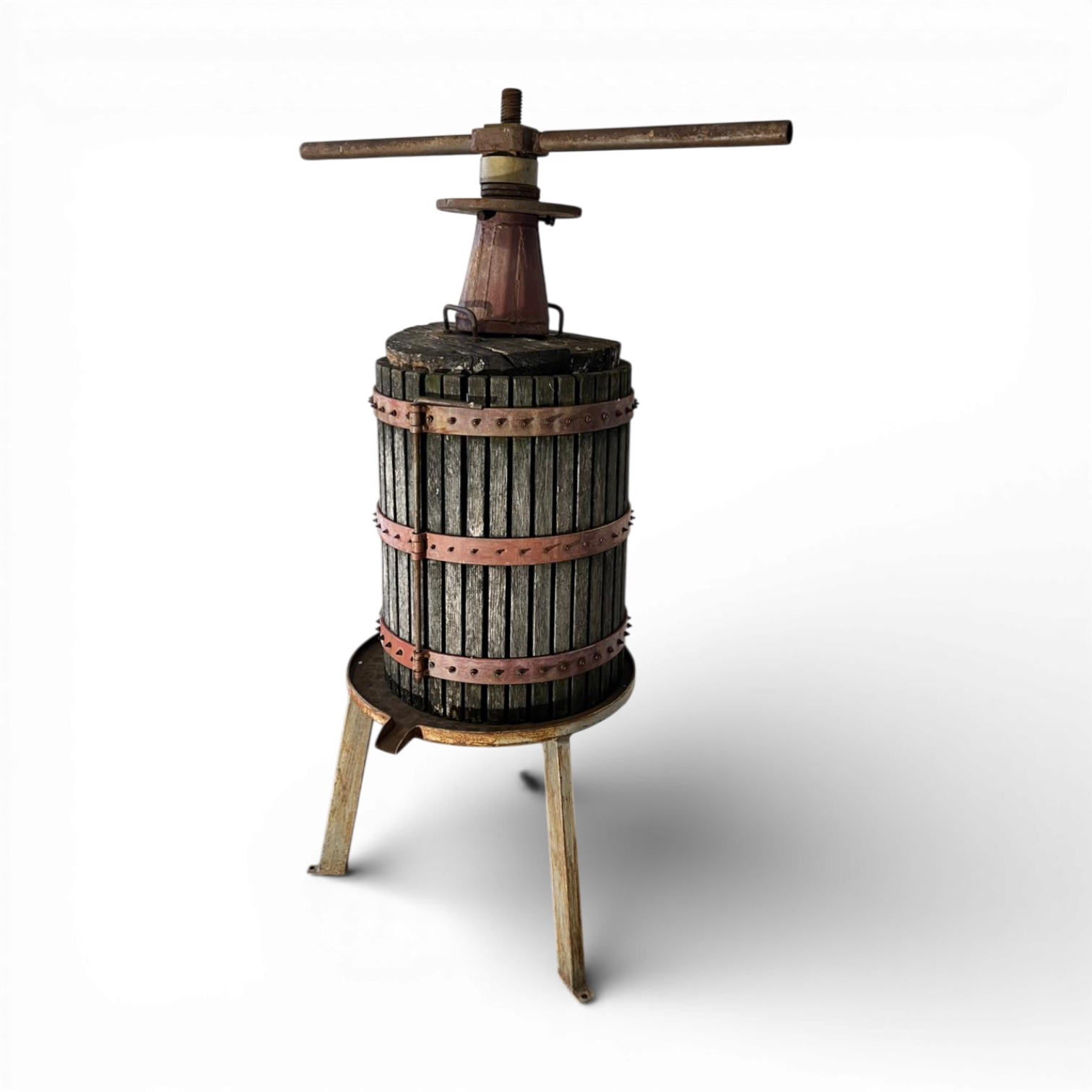 Questo torchio manuale è un autentico manufatto da cantina di fine Ottocento, costruito interamente in legno massello con robuste fasce in ferro battuto e rame per resistere alla poderosa pressione vinaria. La vite centrale in ferro e la particolare scanalatura della base rivelano una raffinata ingegneria contadina. Ancora oggi, i segni lasciati dal mosto sulle doghe narrano storie di vendemmie e di convivialità rurale.